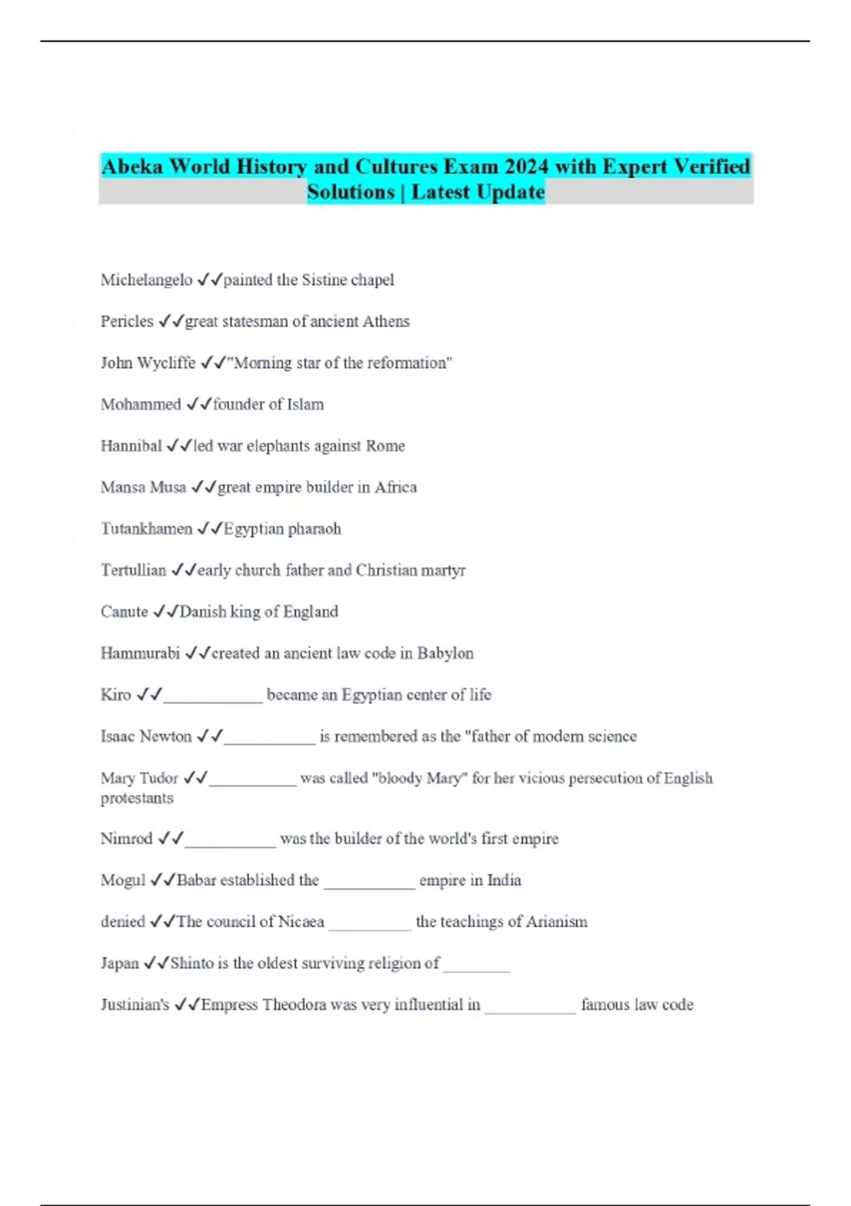Abeka World History and Cultures Exam 2024 with Expert Verified Solutions | Latest Update