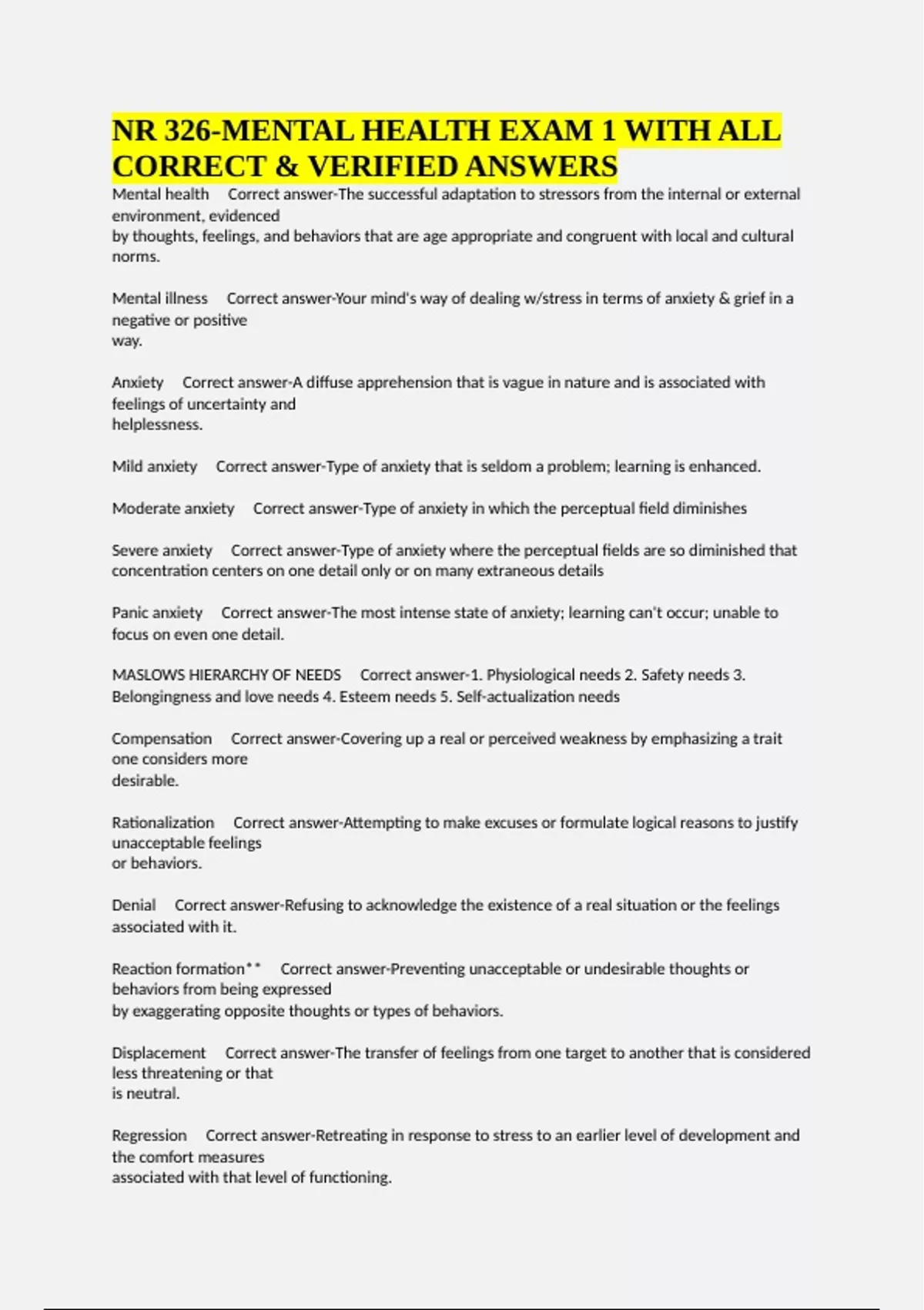 Mental illness Correct answer-Your mind's way of dealing w/stress in terms of anxiety & grief in a