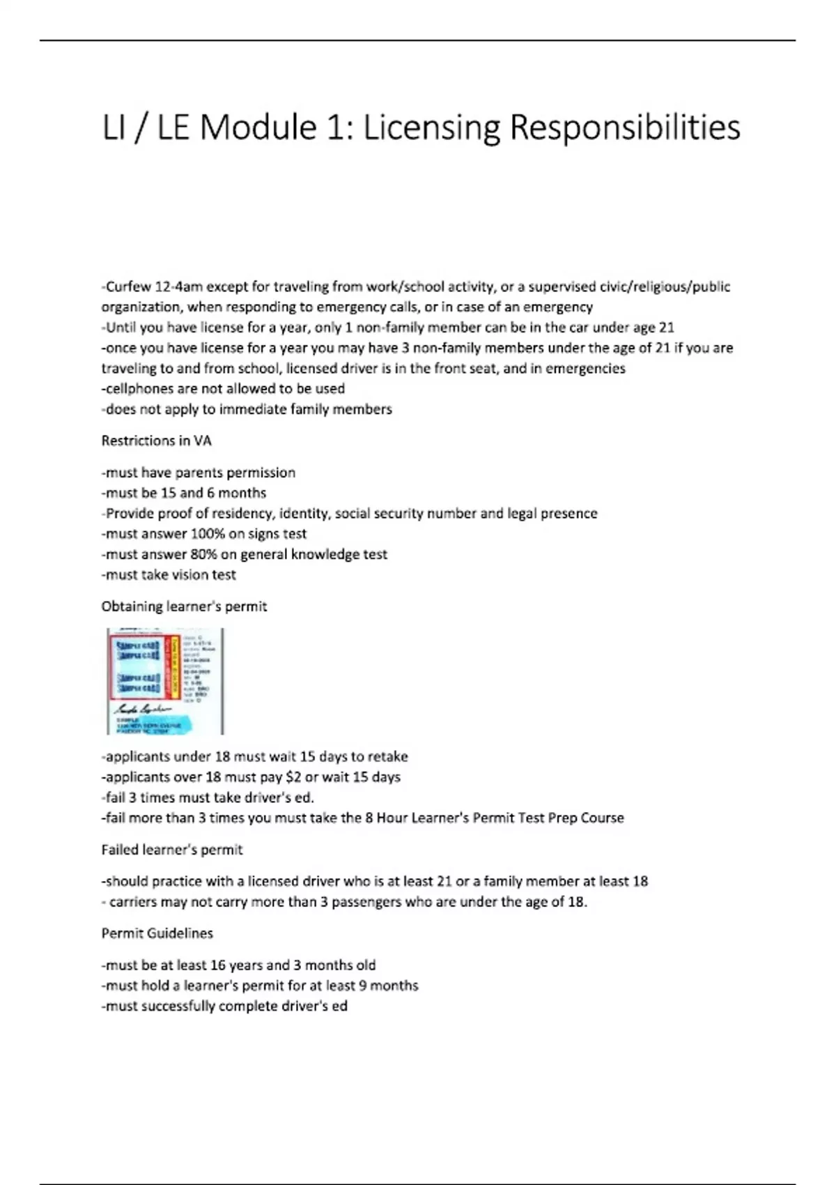 -Curfew 12-4am except for traveling from work/school activity, or a supervised civic/religious/public organization, when responding to emergency calls, or in case of an emergency -Until you have license for a year, only 1 non-family member can be in the car under age 21 -once you have license for a year you may have 3 non-family members under the age of 21 if you are traveling to and from school, licensed driver is in the front seat, and in emergencies -cellphones are not allowed to be used -does not apply to immediate family members Restrictions in VA -must have parents permission -must be 15 and 6 months -Provide proof of residency, identity, social security number and legal presence -must answer 100% on signs test -must answer 80% on general knowledge test -must take vision test Obtaining learner's permit -applicants under 18 must wait 15 days to retake -applicants over 18 must pay $2 or wait 15 days -fail 3 times must take driver's ed. -fail more than 3 times you must take the 8 Hour Learner's Permit Test Prep Course Failed learner's permit -should practice with a licensed driver who is at least 21 or a family member at least 18 - carriers may not carry more than 3 passengers who are under the age of 18. Permit Guidelines -must be at least 16 years and 3 months old -must hold a learner's permit for at least 9 months -must successfully complete driver's ed - parent permission as well as a certified 45 hours (at least 15 of which were after sunset) is a must for applicants under the age of 18. - must attend Partners for Safe Teen Driving Program with you parent/guardian -When you start driving, you must carry with you, your 180 day temporary license (TDL-180) - Obtaining Driver's license -choice will be shown on license and permit with a heart -anyone can be a donor -it does not cost anything -you can be a donor in any state Organ Donor -will receive notice of date to appear within the initial 180 day licensing period -Judge will give your parents the hard copy of your license at a ceremony -must dress appropriately, be on time, and bring learner's permit and 180-day temporary driver's license Licensing Ceremony -expires on your birthday every 8 years -Applicants 18 years of age or less will be required to retake the signs and general knowledge tests if they have any traffic convictions License expiration date -Suspension - Your privilege to drive has been withdrawn temporarily -Revocation - Your privilege to drive has been terminated -1st offense under