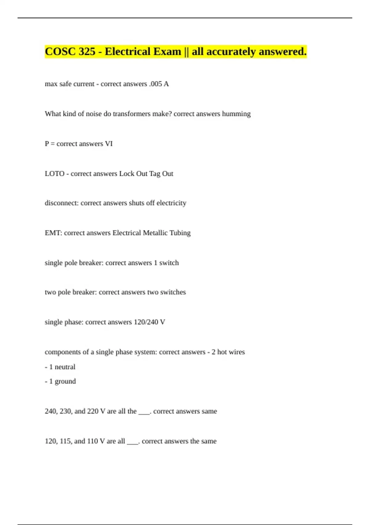 COSC 325 - Electrical Exam || all accurately answered.