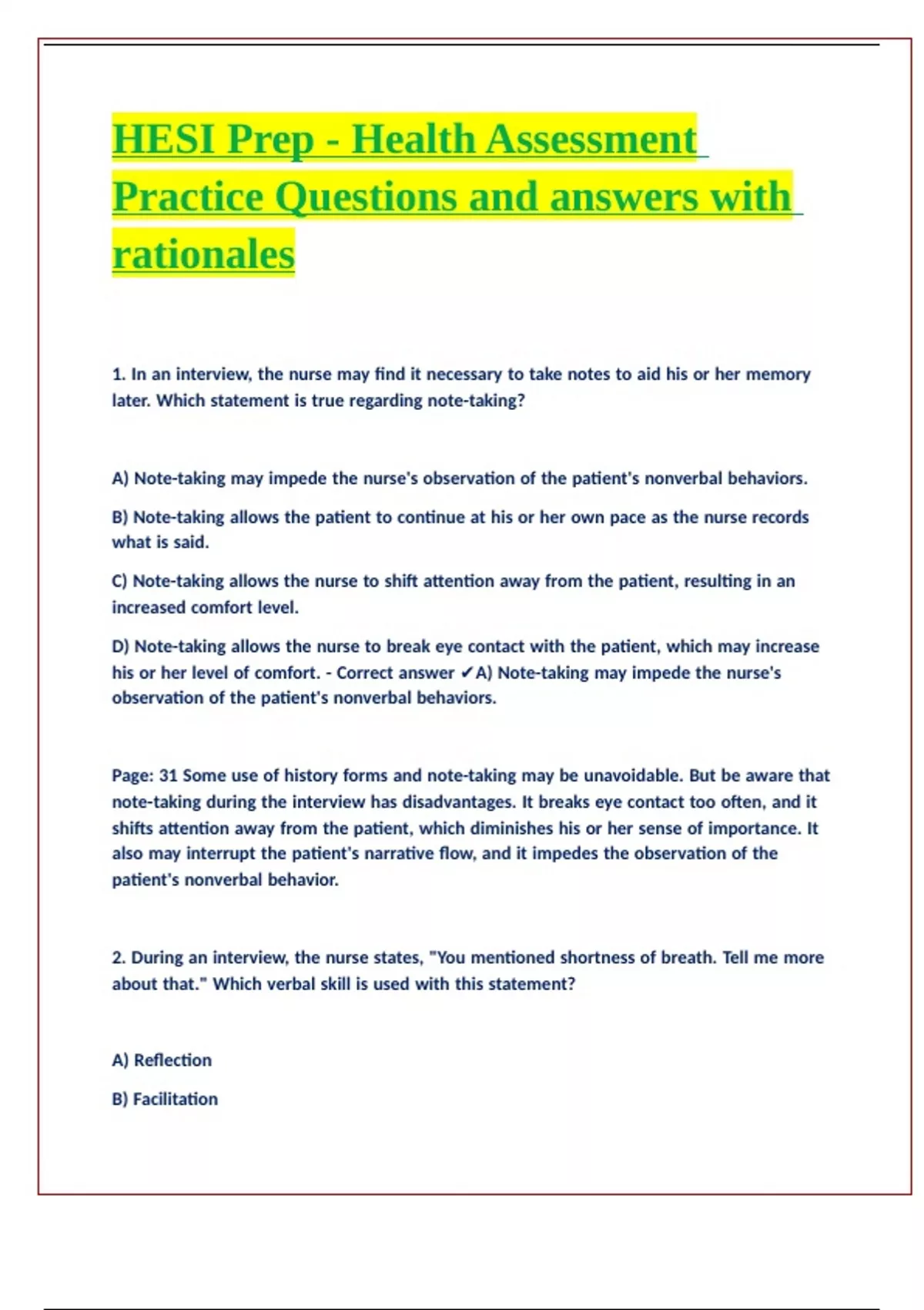 his or her level of comfort. - Correct answer ✔A) Note-taking may impede the nurse's