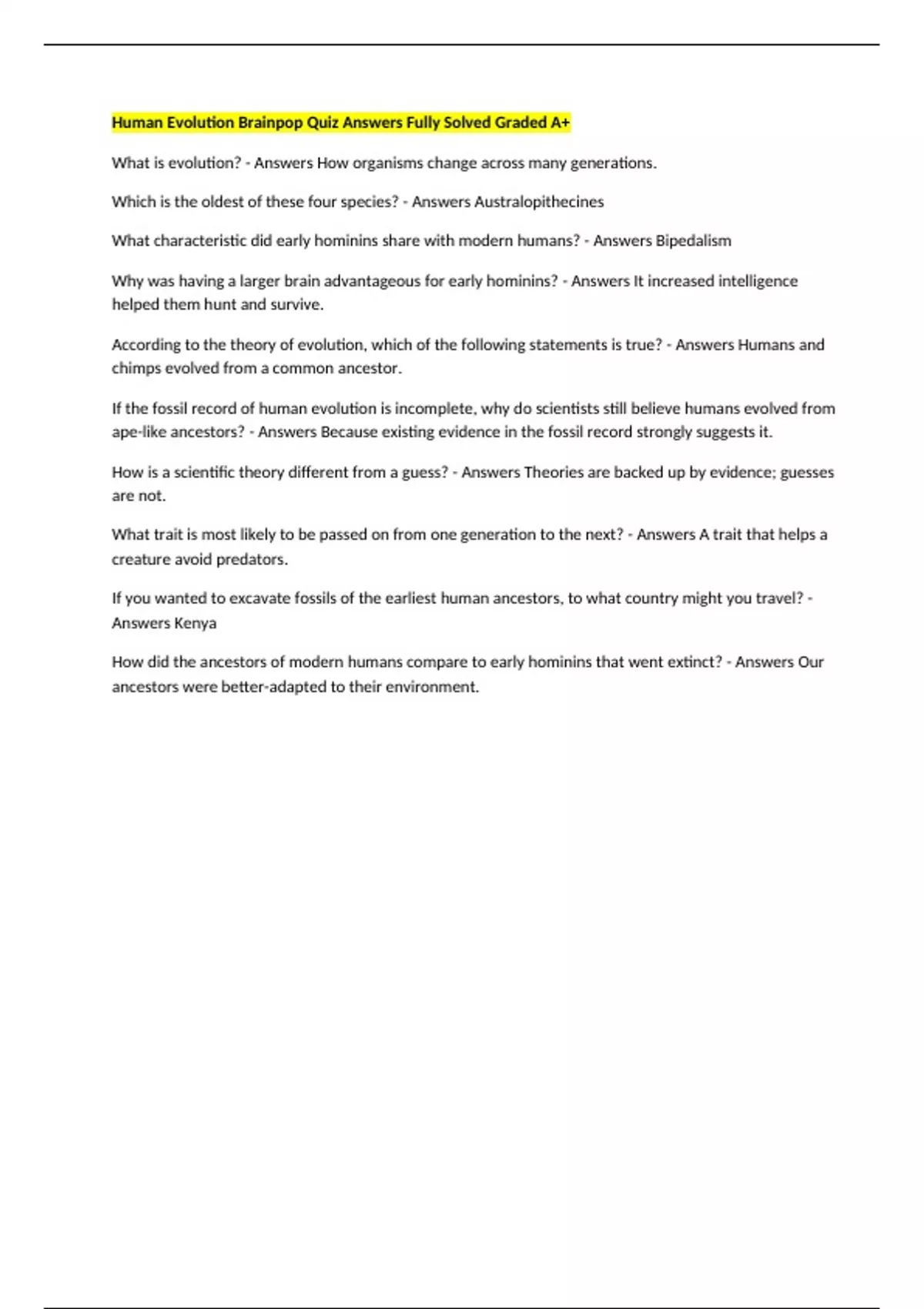 Human Evolution Brainpop Quiz Answers Fully Solved Graded A+