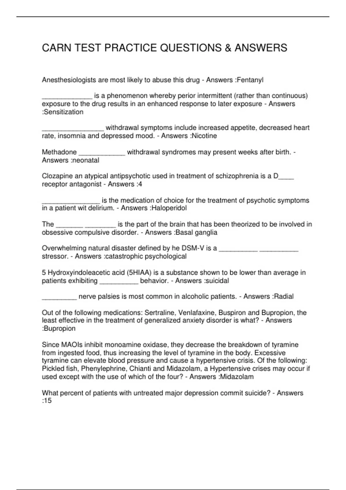 CARN TEST PRACTICE QUESTIONS & ANSWERS