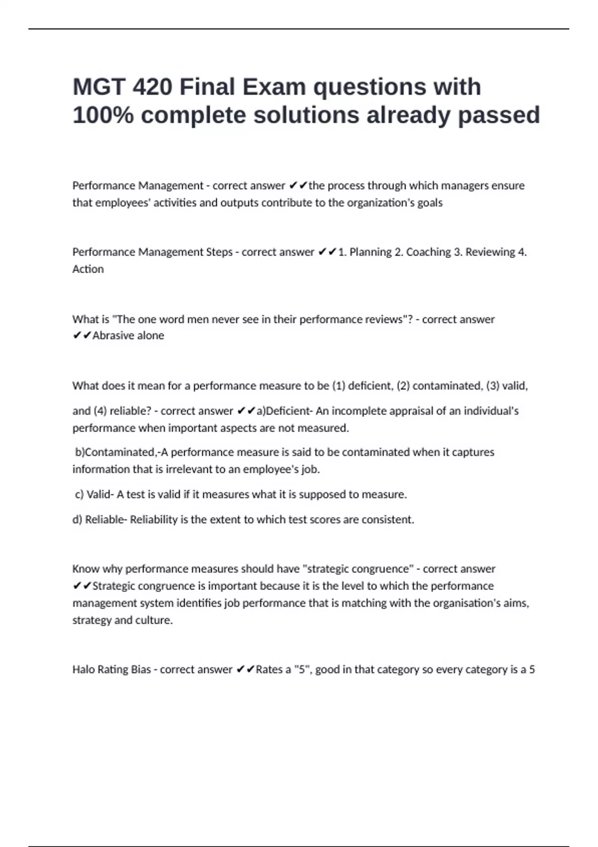 MGT 420 Final Exam questions with 100% complete solutions already passed