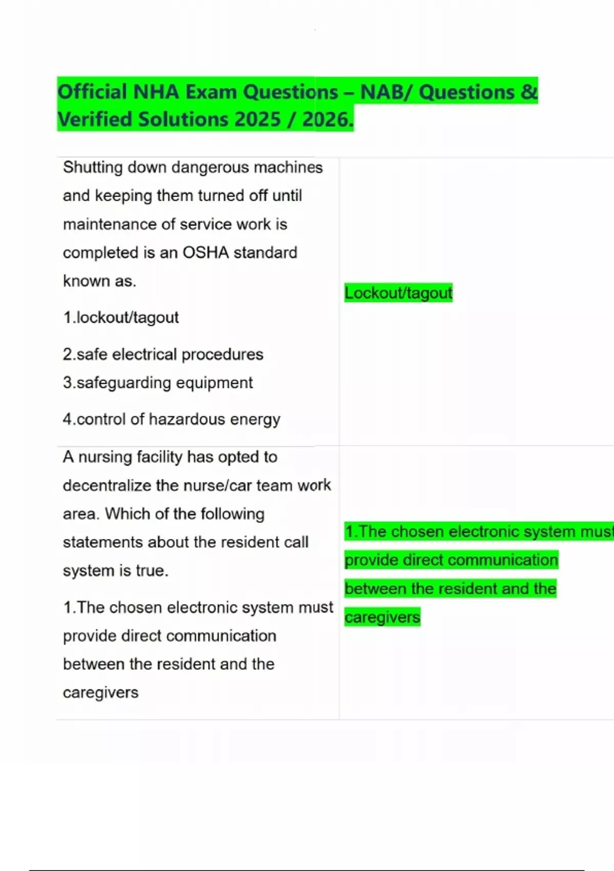 Official NHA Exam Questions – NAB/ Questions & Verified Solutions 2025 / 2026. Shutting down dangerous machines and keeping them turned off until maintenance of service work is completed is an OSHA standard known as. ut/tagout electrical procedures uarding equipment ol of hazardous energy Lockout/tagout A nursing facility has opted to decentralize the nurse/car team work area. Which of the following statements about the resident call system is true. 1.The chosen electronic system must provide direct communication between the resident and the caregivers 2.A wireless nurse call system must be installed and approved by the fire marshal 3.The facility must maintain its current electronic system and keep at least one nurse's station 4.The facility must provide all residents with a communication device to keep in their possession 1.The chosen electronic system must provide direct communication between the resident and the caregivers