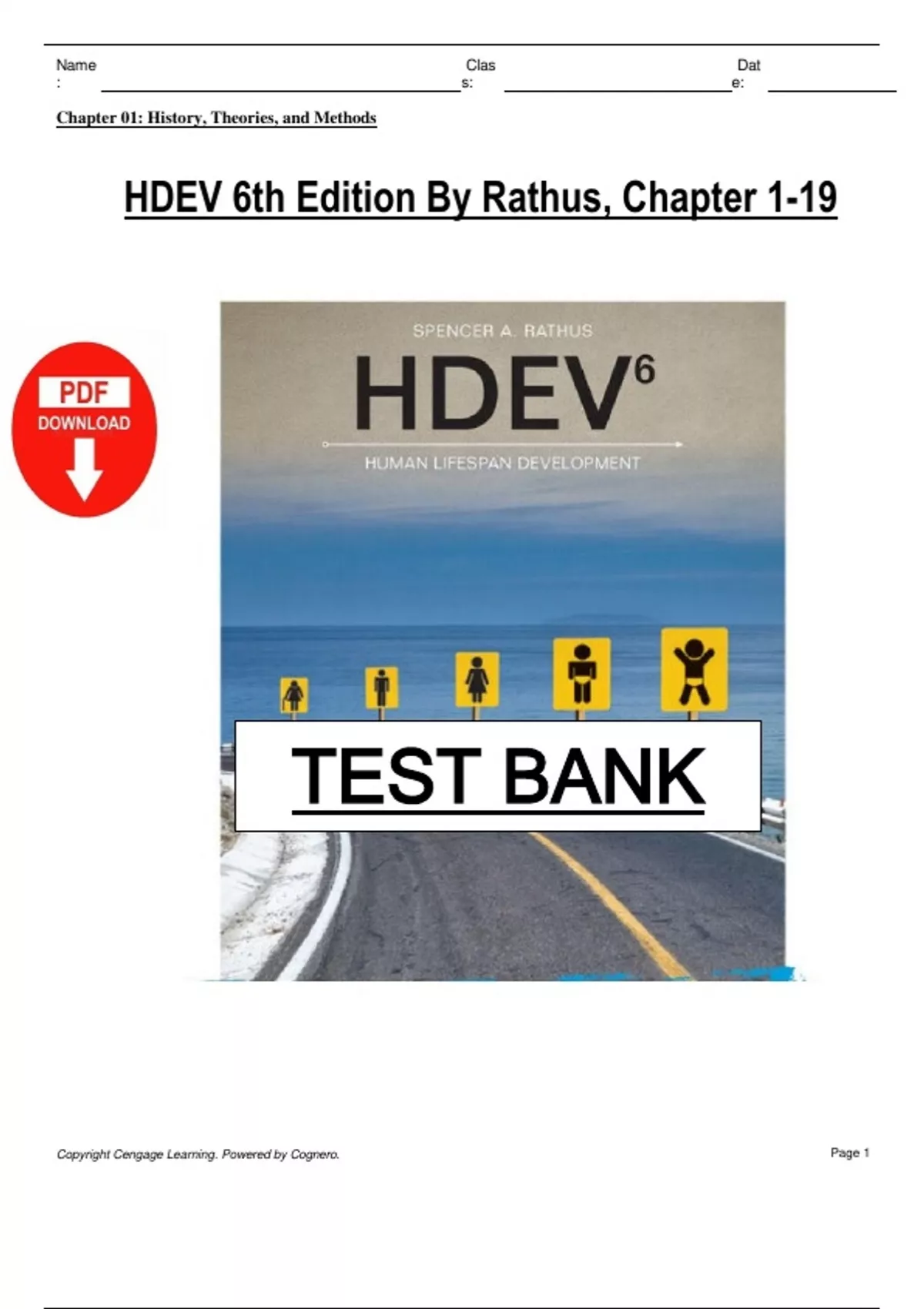 Title: HDEV - Human Development Test Bank | Spencer A. Rathus | 6th Edition | Complete Exam Practice Material Description: This document contains a comprehensive test bank for the 6th edition of HDEV by Spencer A. Rathus. It includes hundreds of multiple-choice, true/false, completion, and essay questions covering all 19 chapters, from history and theories of development to aging and life's final chapter. This material is ideal for exam preparation, quizzes, and in-depth review of developmental psychology concepts. Keywords: developmental psychology human development test bank multiple choice questions true false questions HDEV 6th edition Spencer A. Rathus exam prep psychological theories lifespan development prenatal development cognitive development psychosocial theory Freud and Erikson Piaget and Vygotsky nature vs nurture research methods in psychology genetics and heredity child and adolescent development