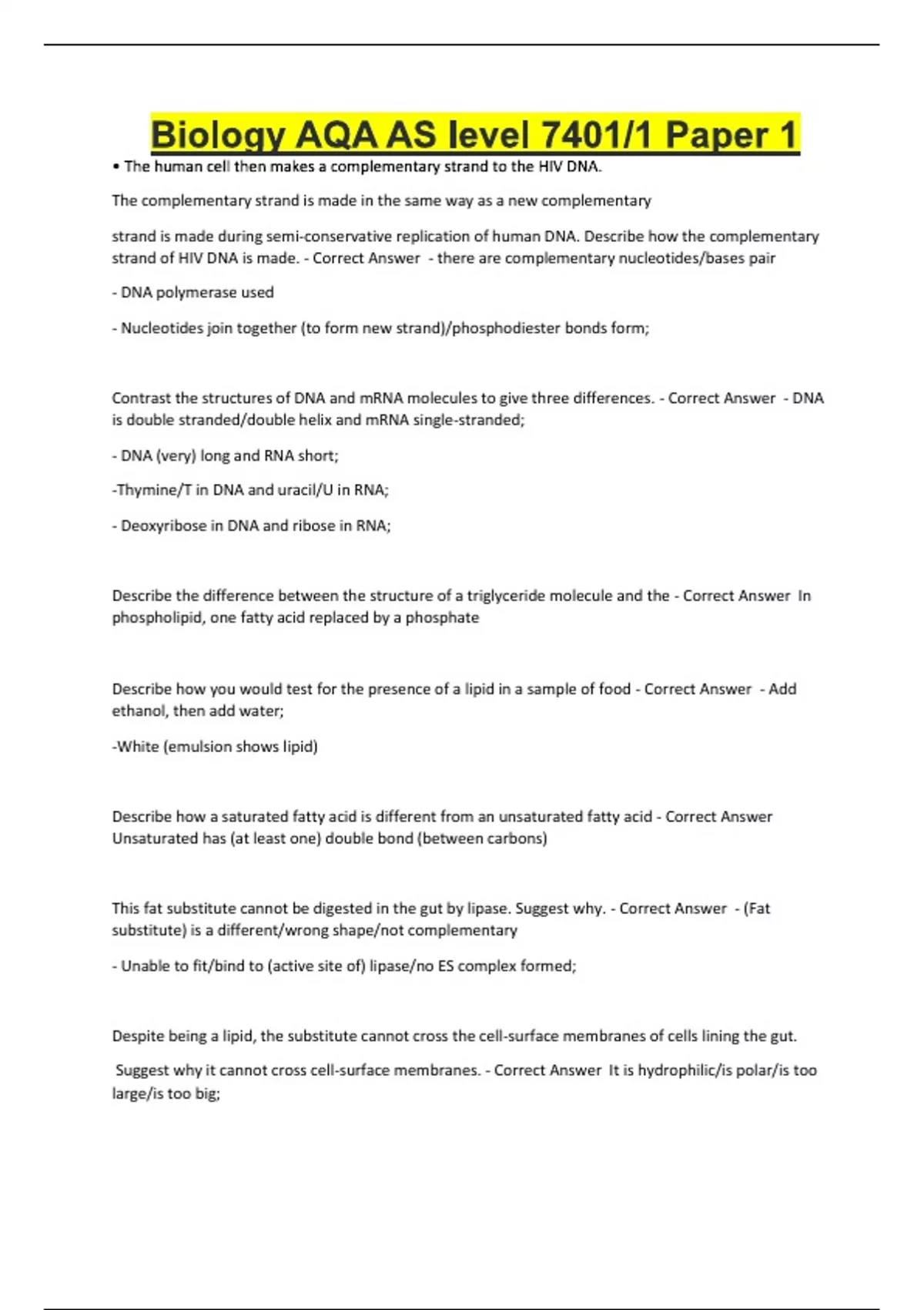 Biology AQA AS level 7401/1 Paper 1 • The human cell then makes a complementary strand to the HIV DNA. The complementary strand is made in the same way as a new complementary strand is made during semi-conservative replication of human DNA. Describe how the complementary strand of HIV DNA is made. - Correct Answer - there are complementary nucleotides/bases pair - DNA polymerase used - Nucleotides join together (to form new strand)/phosphodiester bonds form; Contrast the structures of DNA and mRNA molecules to give three differences. - Correct Answer - DNA is double stranded/double helix and mRNA single-stranded; - DNA (very) long and RNA short; -Thymine/T in DNA and uracil/U in RNA; - Deoxyribose in DNA and ribose in RNA; Describe the difference between the structure of a triglyceride molecule and the - Correct Answer In phospholipid, one fatty acid replaced by a phosphate Describe how you would test for the presence of a lipid in a sample of food - Correct Answer - Add ethanol, then add water; -White (emulsion shows lipid) Describe how a saturated fatty acid is different from an unsaturated fatty acid - Correct Answer Unsaturated has (at least one) double bond (between carbons) This fat substitute cannot be digested in the gut by lipase. Suggest why. - Correct Answer - (Fat substitute) is a different/wrong shape/not complementary - Unable to fit/bind to (active site of) lipase/no ES complex formed; Despite being a lipid, the substitute cannot cross the cell-surface membranes of cells lining the gut. Suggest why it cannot cross cell-surface membranes. - Correct Answer It is hydrophilic/is polar/is too large/is too big; Cells constantly hydrolyse ATP to provide energy. Describe how ATP is resynthesised in cells. - Correct Answer - From ADP and phosphate; - By ATP synthase; - During respiration/photosynthesis; Give two ways in which the hydrolysis of ATP is used in cells. - Correct Answer - To provide energy for other reactions/named process; - To add phosphate to other substances and make them more reactive/change their shape What is the evidence from Figure 2 that a scanning electron microscope was used to take this photograph? - Correct Answer (Can see) 3D image name the part of the mitochondrion labelled X in Figure 2 - Correct Answer Crista/cristae Y is a protein. One function of Y is to tr