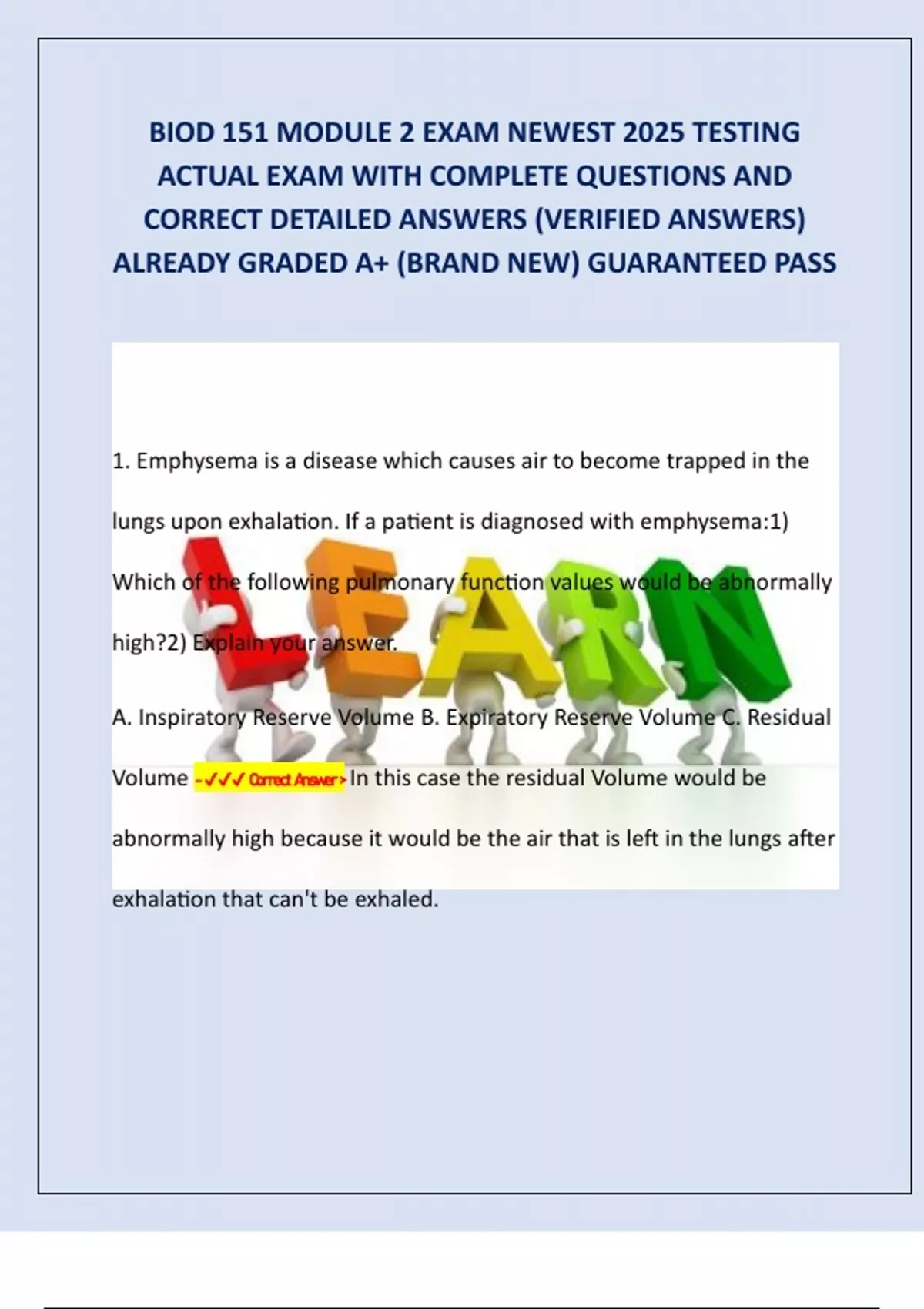 BIOD 151 MODULE 2 EXAM NEWEST 2025 TESTING ACTUAL EXAM WITH COMPLETE QUESTIONS AND CORRECT DETAILED ANSWERS (VERIFIED ANSWERS) ALREADY GRADED A+ (BRAND NEW) GUARANTEED PASS BIOD 151 MODULE 2 EXAM NEWEST 2025 TESTING ACTUAL EXAM WITH COMPLETE QUESTIONS AND CORRECT DETAILED ANSWERS (VERIFIED ANSWERS) ALREADY GRADED A+ (BRAND NEW) GUARANTEED PASS