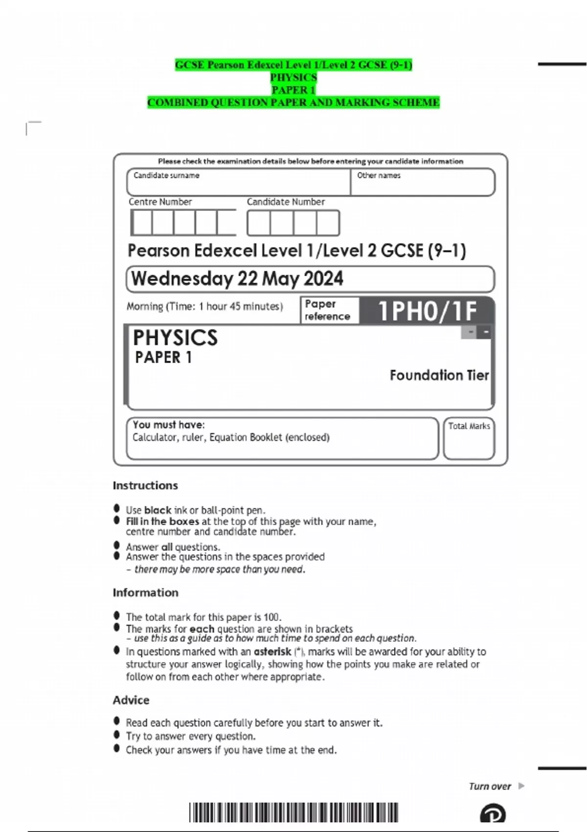 GCSE Pearson Edexcel Level 1/Level 2 GCSE (9–1) PHYSICS PAPER 1 COMBINED QUESTION PAPER AND MARKING SCHEME