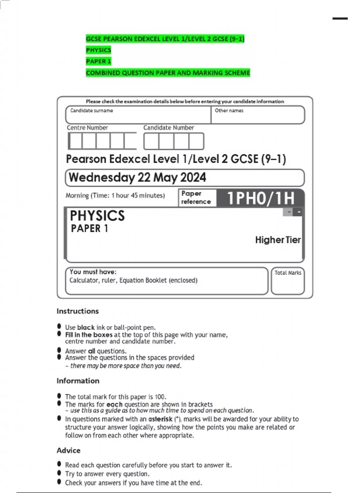 GCSE PEARSON EDEXCEL LEVEL 1/LEVEL 2 GCSE (9–1) PHYSICS PAPER 1 COMBINED QUESTION PAPER AND MARKING SCHEME