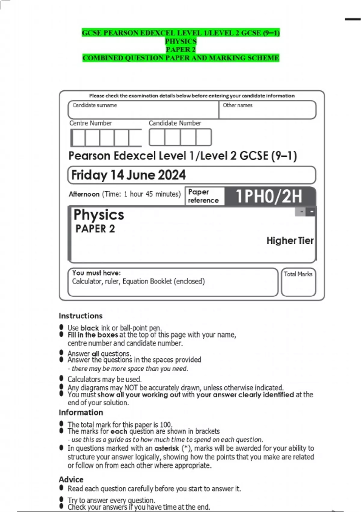GCSE PEARSON EDEXCEL LEVEL 1/LEVEL 2 GCSE (9–1) PHYSICS PAPER 2 COMBINED QUESTION PAPER AND MARKING SCHEME