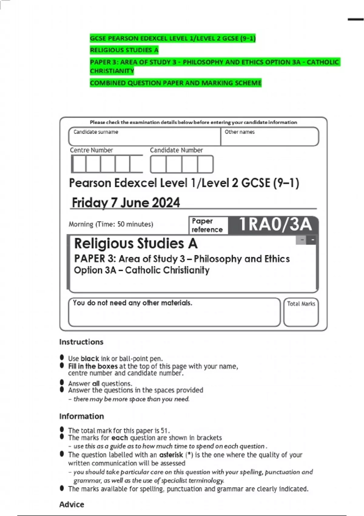 GCSE PEARSON EDEXCEL LEVEL 1/LEVEL 2 GCSE (9–1) RELIGIOUS STUDIES A PAPER 3: AREA OF STUDY 3 – PHILOSOPHY AND ETHICS OPTION 3A – CATHOLIC CHRISTIANITY COMBINED QUESTION PAPER AND MARKING SCHEME