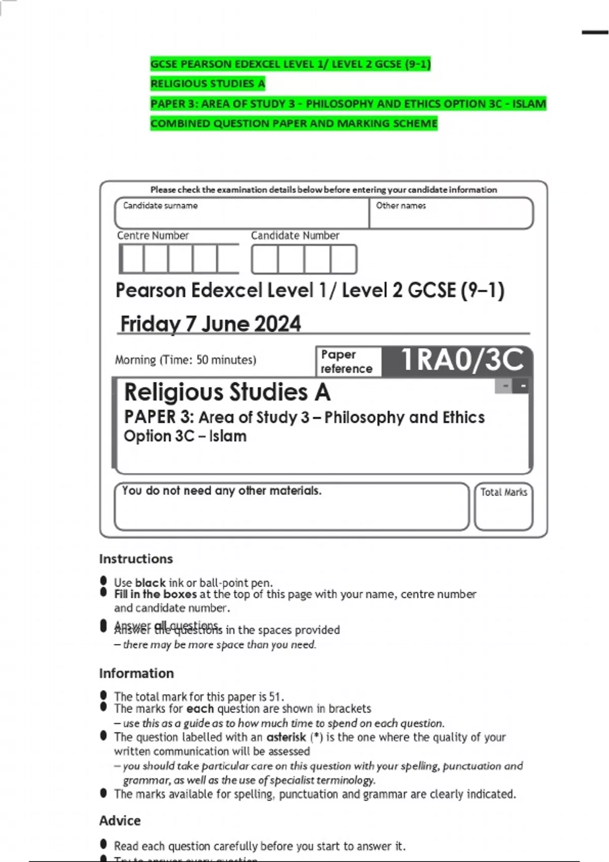 GCSE PEARSON EDEXCEL LEVEL 1/ LEVEL 2 GCSE (9–1) RELIGIOUS STUDIES A PAPER 3: AREA OF STUDY 3 – PHILOSOPHY AND ETHICS OPTION 3C – ISLAM COMBINED QUESTION PAPER AND MARKING SCHEME