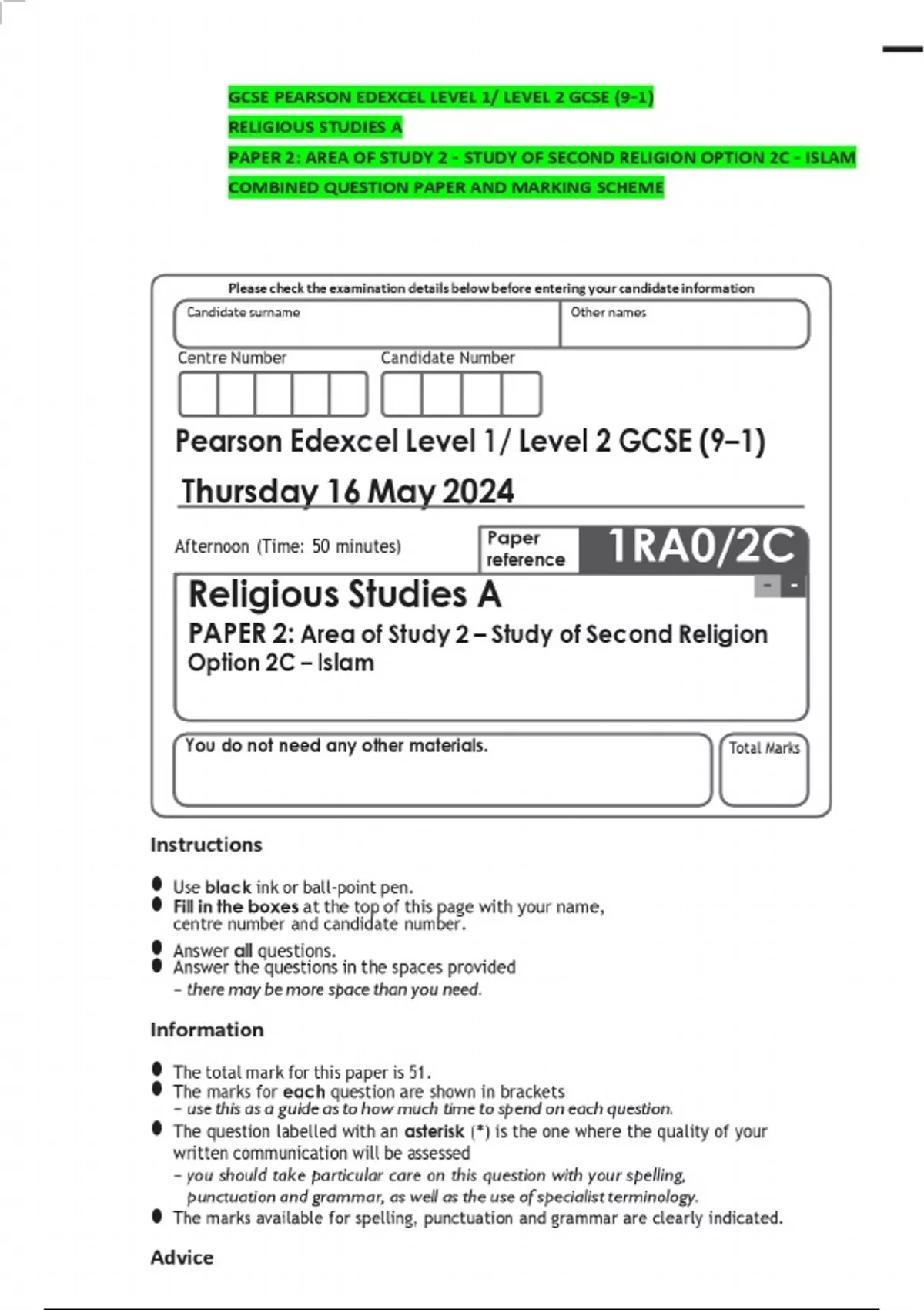 GCSE PEARSON EDEXCEL LEVEL 1/ LEVEL 2 GCSE (9–1) RELIGIOUS STUDIES A PAPER 2: AREA OF STUDY 2 – STUDY OF SECOND RELIGION OPTION 2C – ISLAM COMBINED QUESTION PAPER AND MARKING SCHEME