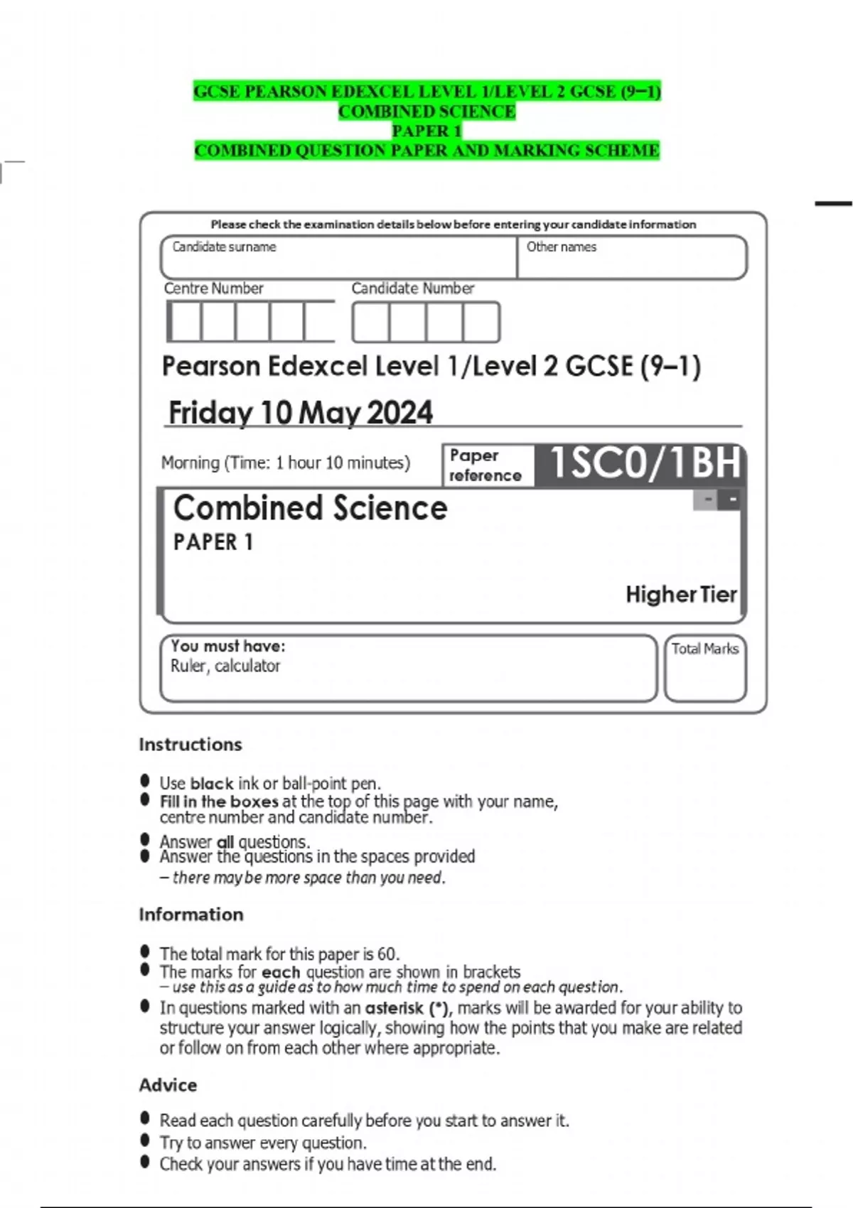GCSE PEARSON EDEXCEL LEVEL 1/LEVEL 2 GCSE (9–1) COMBINED SCIENCE PAPER 1 COMBINED QUESTION PAPER AND MARKING SCHEME