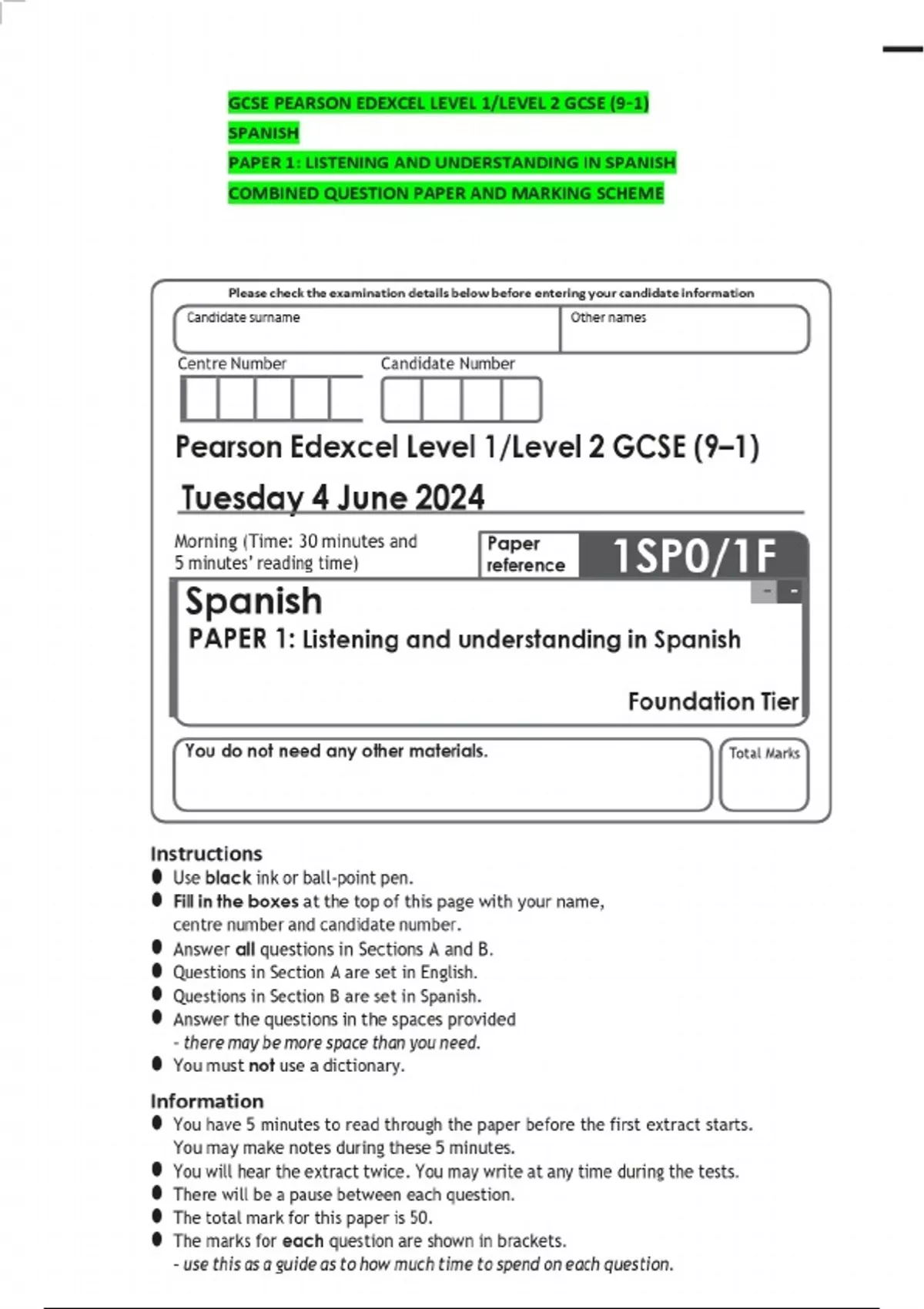 GCSE PEARSON EDEXCEL LEVEL 1/LEVEL 2 GCSE (9–1) SPANISH PAPER 1: LISTENING AND UNDERSTANDING IN SPANISH COMBINED QUESTION PAPER AND MARKING SCHEME