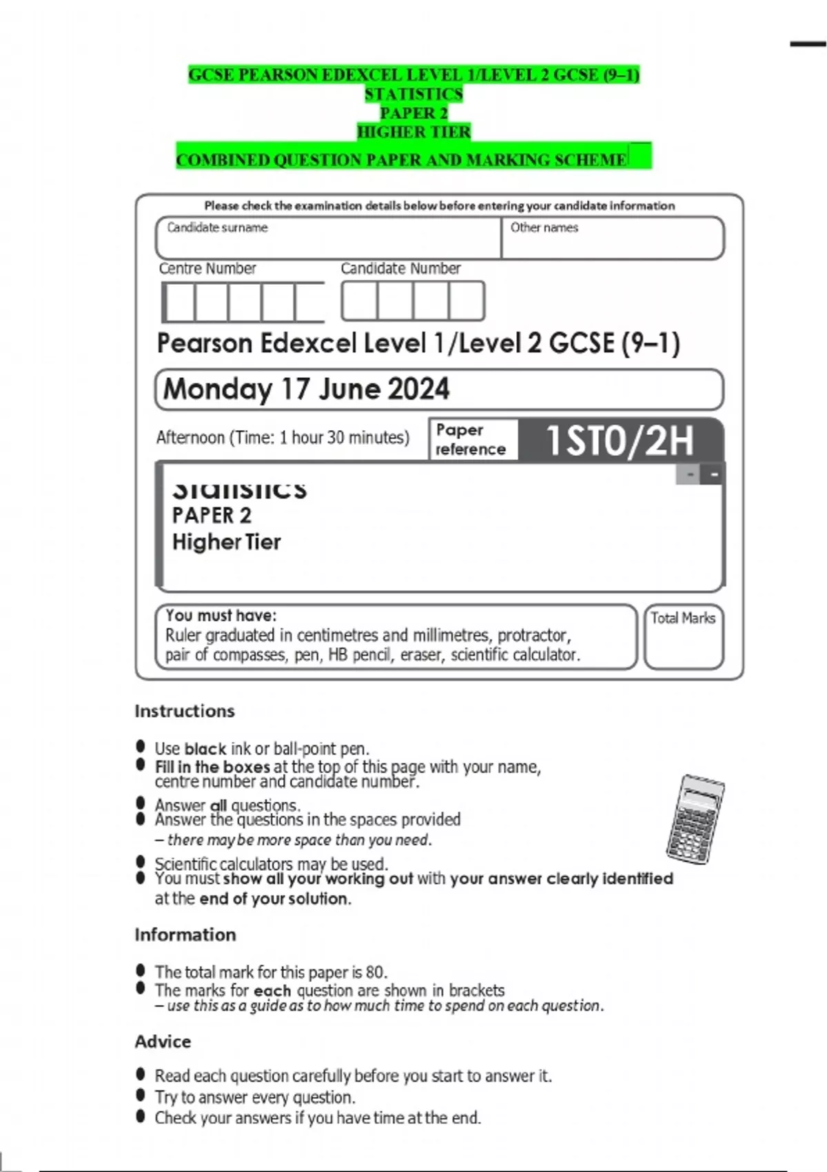 GCSE PEARSON EDEXCEL LEVEL 1/LEVEL 2 GCSE (9–1) STATISTICS PAPER 2 HIGHER TIER COMBINED QUESTION PAPER AND MARKING SCHEME