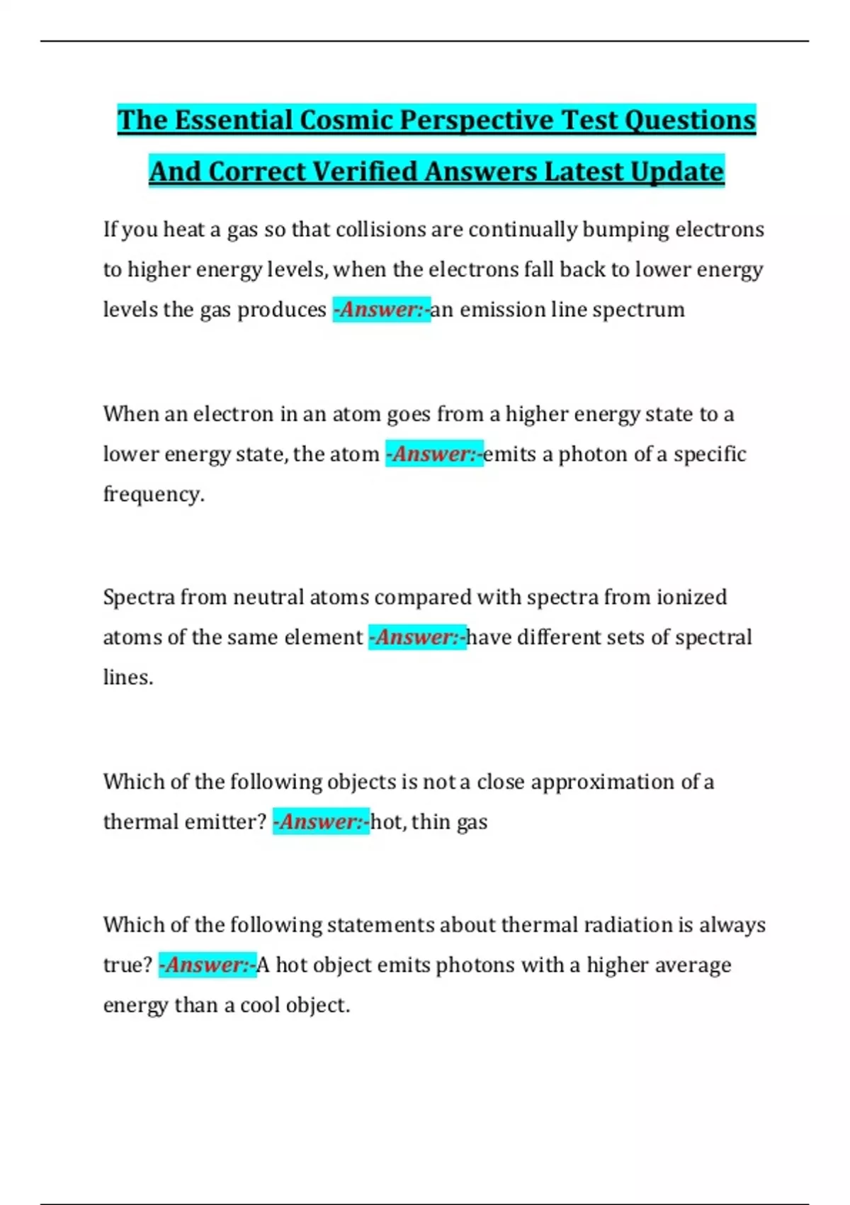 The Essential Cosmic Perspective Test Questions And Correct Verified Answers Latest Update If you heat a gas so that collisions are continually bumping electrons to higher energy levels, when the electrons fall back to lower energy levels the gas produces -Answer:-an emission line spectrum When an electron in an atom goes from a higher energy state to a lower energy state, the atom -Answer:-emits a photon of a specific frequency. Spectra from neutral atoms compared with spectra from ionized atoms of the same element -Answer:-have different sets of spectral lines. Which of the following objects is not a close approximation of a thermal emitter? -Answer:-hot, thin gas Which of the following statements about thermal radiation is always true? -Answer:-A hot object emits photons with a higher average energy than a cool object.