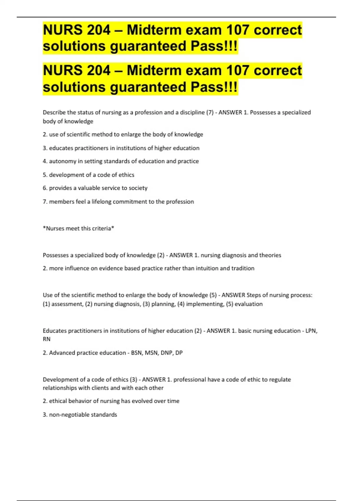NURS 204 – Midterm exam 107 correct solutions guaranteed Pass!!!