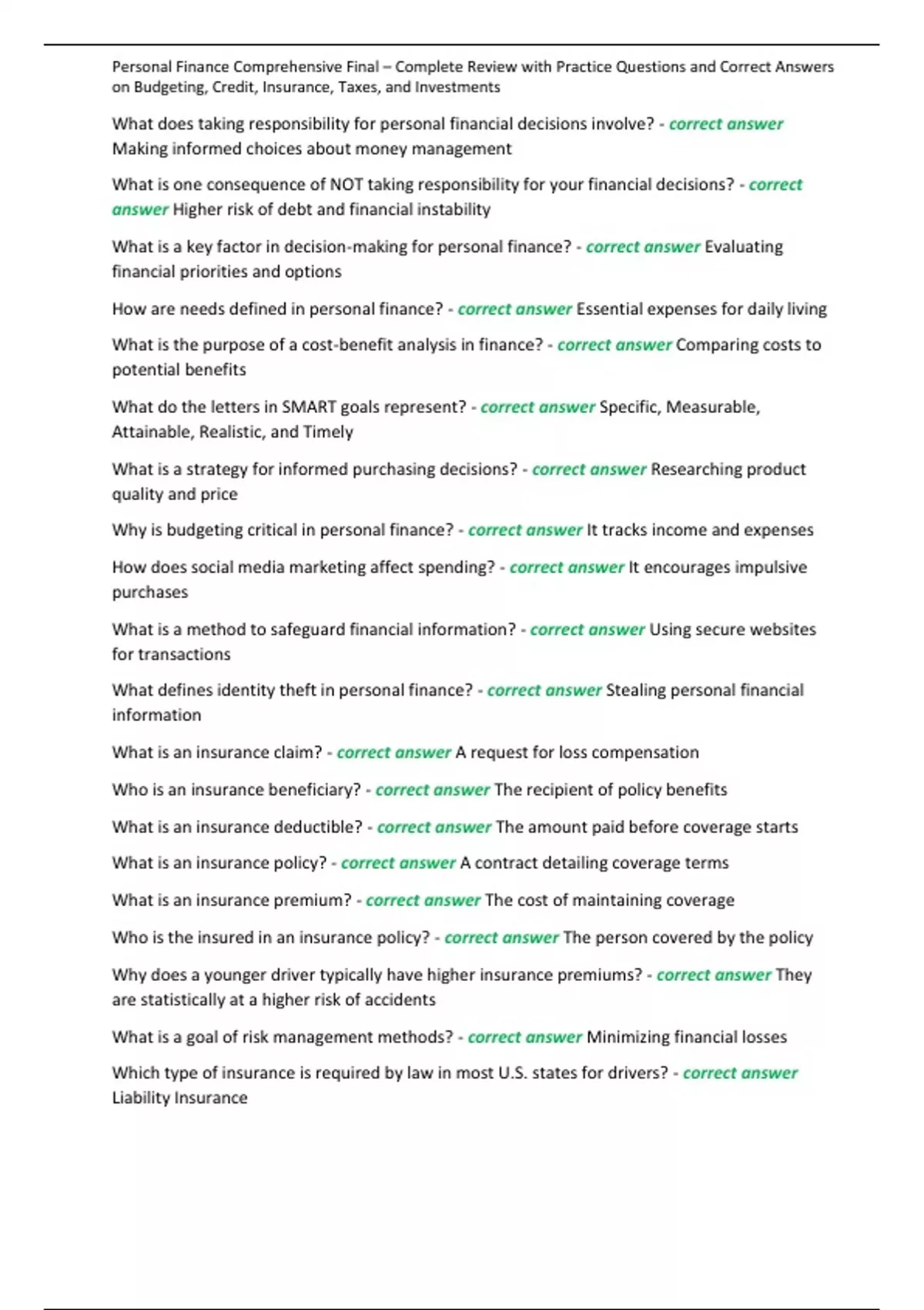 , Personal Finance Comprehensive Final – Complete Review with Practice Questions and Correct Answers