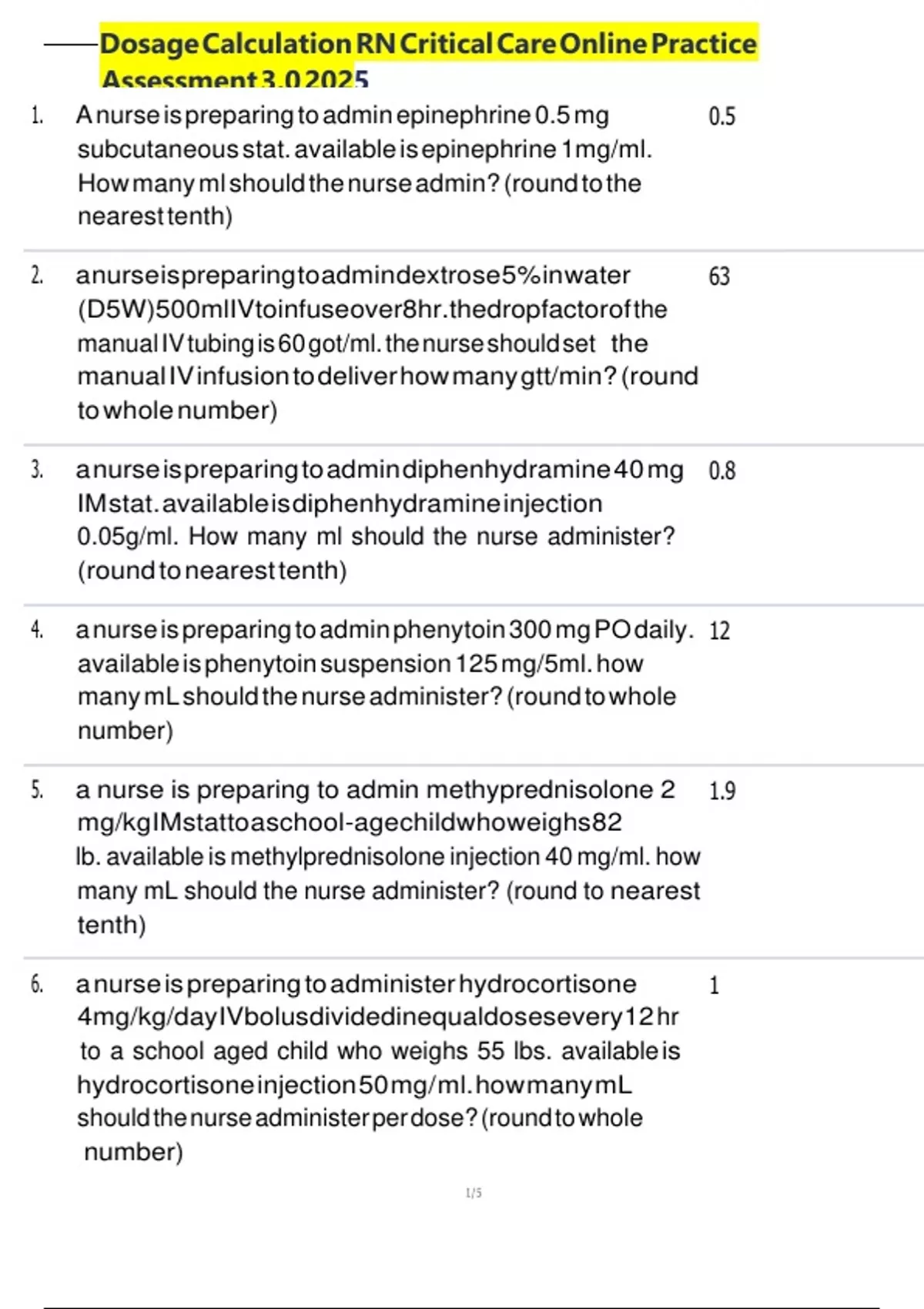 Dosage Calculation RN Critical Care Online Practice Assessment 3.0 2024 a nurse is preparing to admin dextrose 5% in water (D5W) 500 ml IV to infuse over 8 hr. the drop factor of the manual IV tubing is 60 got/ml. the nurse should set the manual IV infusion to deliver how many gtt/min? (round to whole number) - correct answer--63 a nurse is preparing to admin diphenhydramine 40 mg IM stat. available is diphenhydramine injection 0.05g/ml. How many ml should the nurse administer? (round to nearest tenth) - correct answer--0.8 A nurse is preparing to admin epinephrine 0.5 mg subcutaneous stat. available is epinephrine 1mg/ml. How many ml should the nurse admin? (round to the nearest tenth) - correct answer--0.5 a nurse is preparing to admin methyprednisolone 2 mg/kg IM stat to a school-age child who weighs 82 lb. available is methylprednisolone injection 40 mg/ml. how many mL should the nurse administer? (round to nearest tenth) - correct answer--1.9 a nurse is preparing to admin phenytoin 300 mg PO daily. available is phenytoin suspension 125 mg/5ml. how many mL should the nurse administer? (round to whole number) - correct answer--12 a nurse is preparing to administer 0.9% sodium chloride (0.9% NaCl) 10mL/kg IV to infuse over 3 hr to a toddler who weighs 28 lbs. the nurse should set the IV pump to deliver how many ml/hr? (round to whole number) - correct answer--42 a nurse is preparing to administer 0.9% sodium chloride (0.9% NaCl) 20 mL/kg Iv to infuse over 6 hr to a school-age child who weighs 55 lbs. the nurse should set the IV pump to deliver how many mL/hr? (round to whole number) - correct answer--83 a nurse is preparing to administer 0.9% sodium chloride (0.9% NaCl) 50 mL IV to infuse over 30 min. the nurse should set the IV pump to deliver how many mL/hr? (round to whole number) - correct answer--100 a nurse is preparing to administer cefazolin 30 mg/kg IV bolus to a preschooler who weighs 37.4 lb. available is cefazolin injection 20 mg/ml. how many mL should the nurse administer per dose? (round to nearest tenth) - correct answer--26 a nurse is preparing to administer cefotaxime 1,000 mg IM every 8 hr. available is cefotaxime injection 0.33 g/ mL. how many mL should the nurse administer per dose? (round to whole number) - correct answer--3