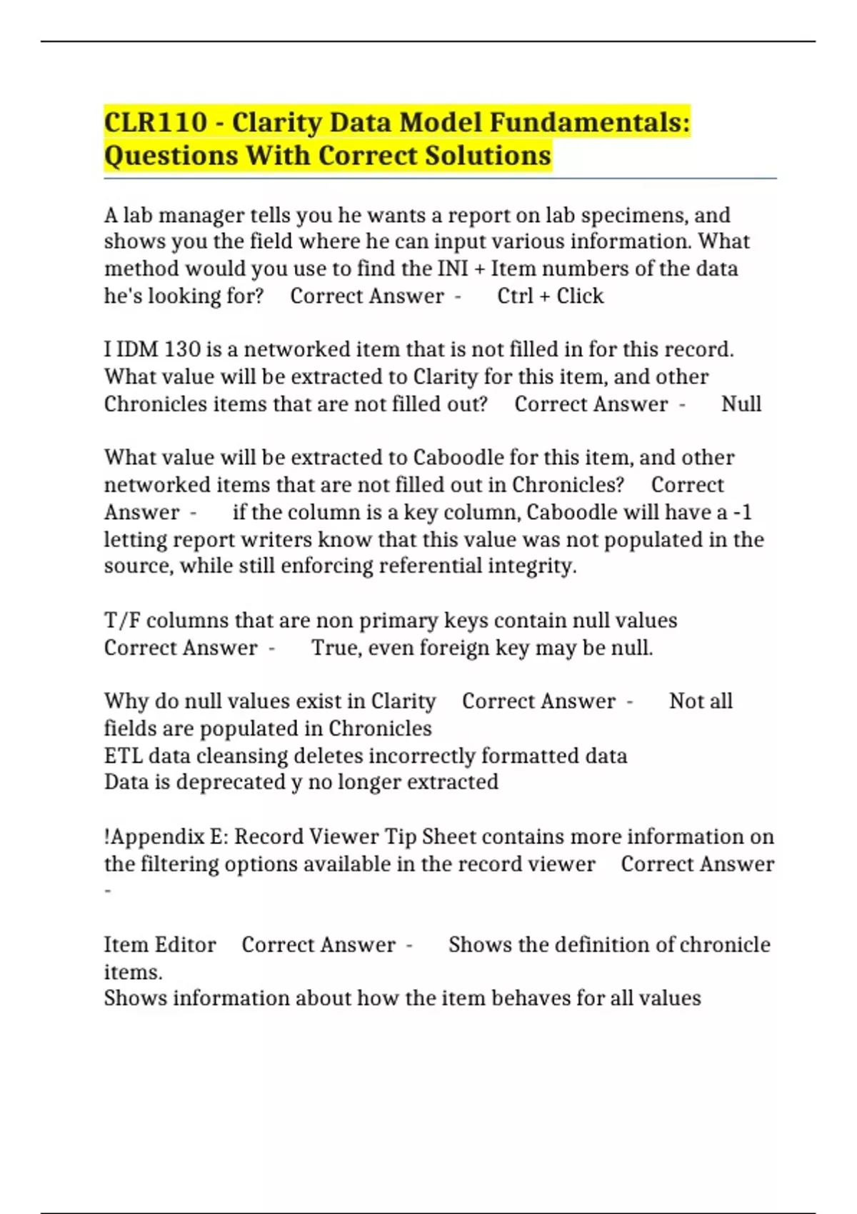 CLR110 - Clarity Data Model Fundamentals: Questions With Correct Solutions