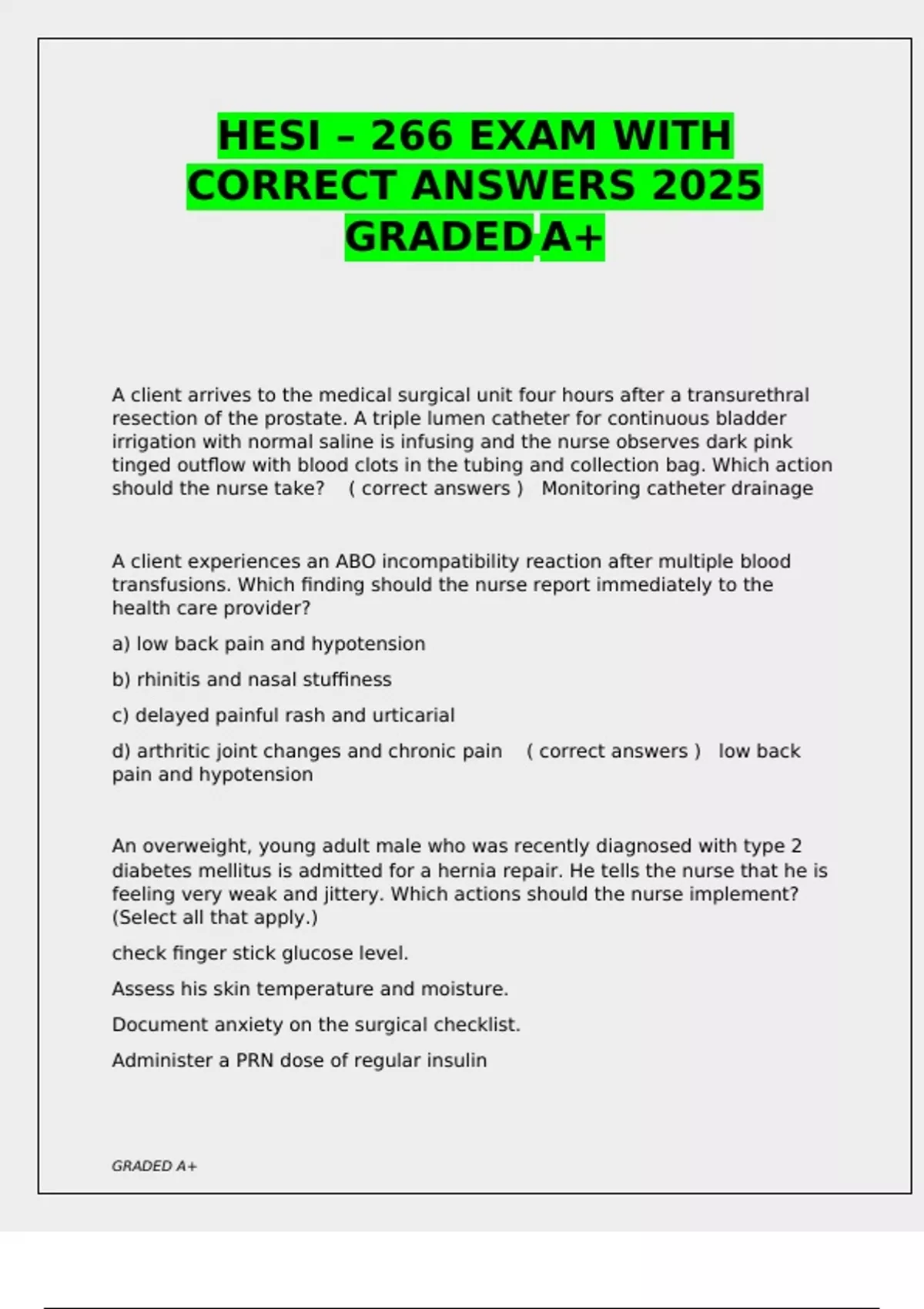 HESI – 266 EXAM WITH CORRECT ANSWERS 2025 GRADED A+