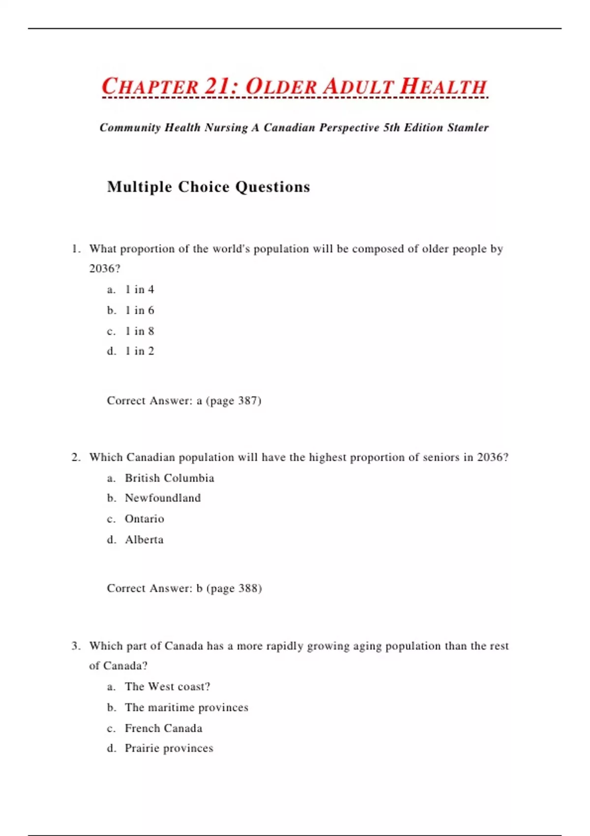 TEST BANK COMMUNITY HEALTH NURSING: A CANADIAN PERSPECTIVE 5th Edition, By Stamler, Yiu {Chapter 21-25}
