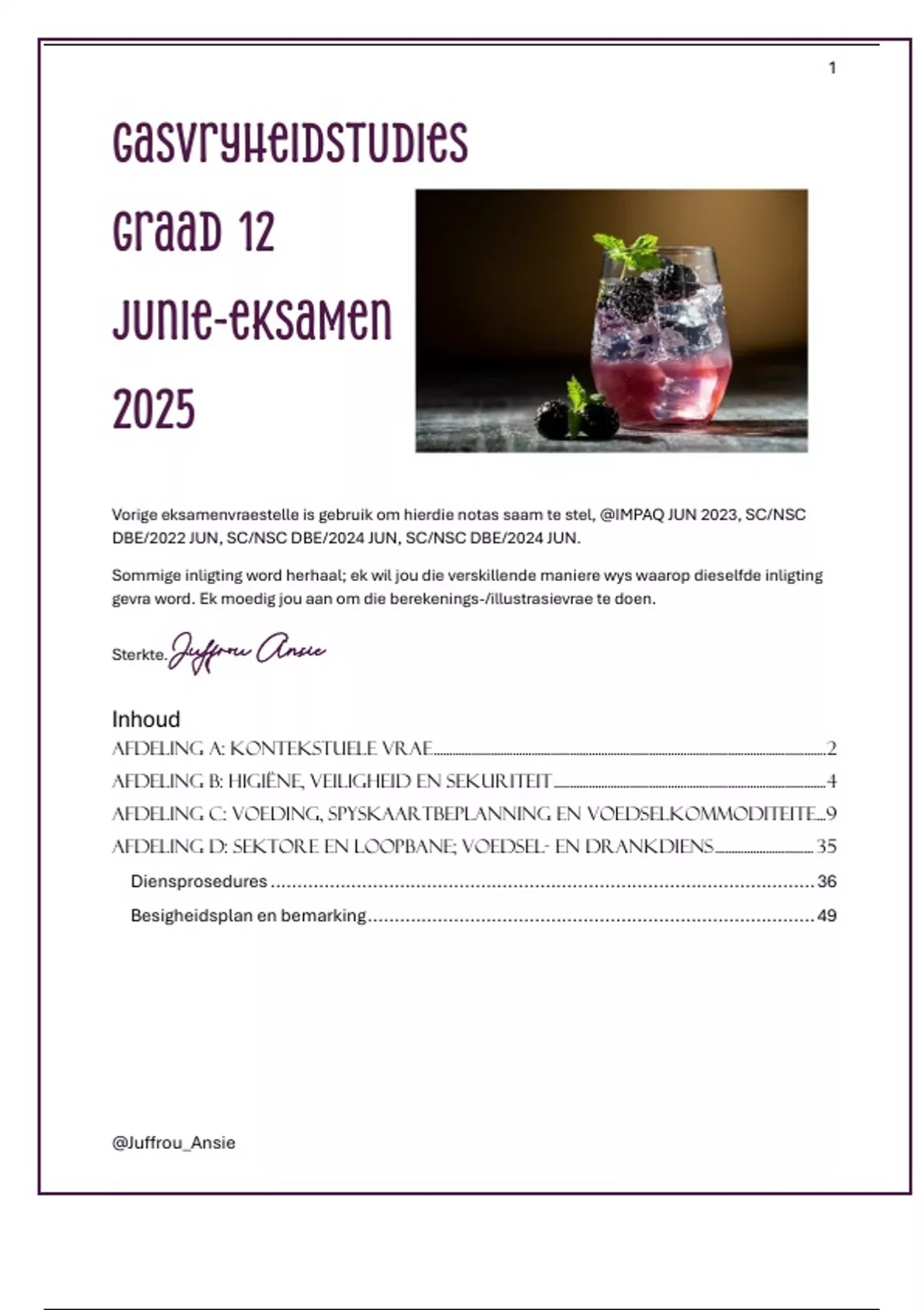 Inhoud AFDELING A: KONTEKSTUELE VRAE............................................................................................................................2 AFDELING B: HIGIËNE, VEILIGHEID EN SEKURITEIT......................................................................................4 AFDELING C: VOEDING, SPYSKAARTBEPLANNING EN VOEDSELKOMMODITEITE...9 AFDELING D: SEKTORE EN LOOPBANE; VOEDSEL- EN DRANKDIENS............................... 35 Diensprosedures .....................................................................................................36 Besigheidsplan en bemarking...................................................................................49 Vorige eksamenvraestelle is gebruik om hierdie notas saam te stel, @IMPAQ JUN 2023, SC/NSC DBE/2022 JUN, SC/NSC DBE/2024 JUN, SC/NSC DBE/2024 JUN.