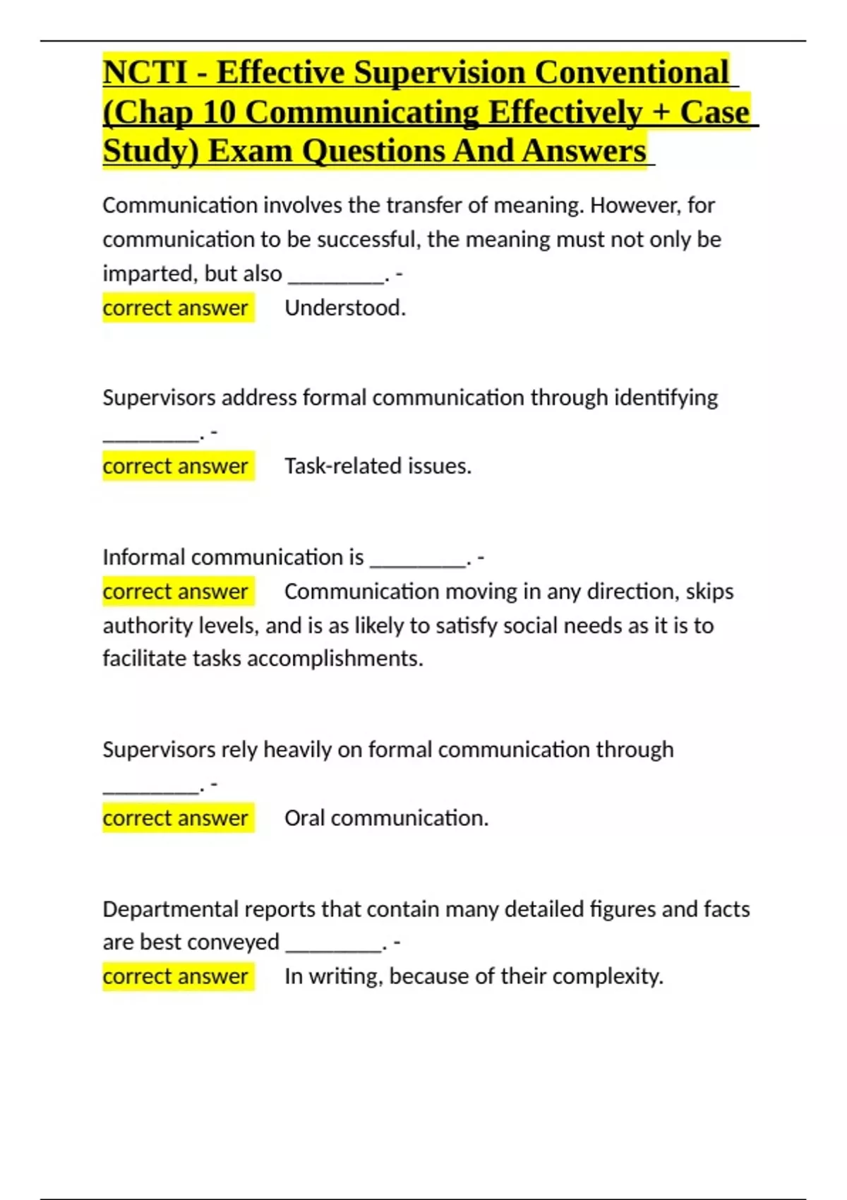NCTI - Effective Supervision Conventional (Chap 10 Communicating Effectively + Case Study) Exam Questions And Answers.docx