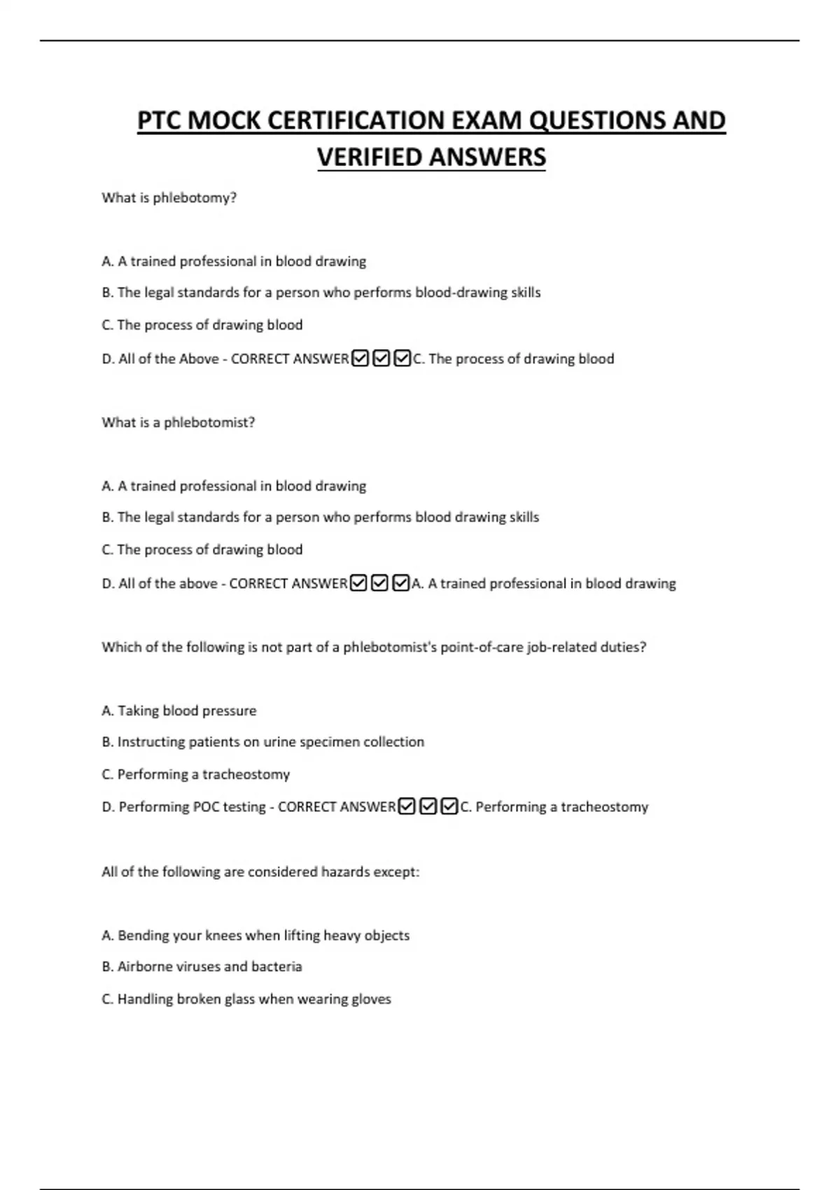 PTC MOCK CERTIFICATION EXAM QUESTIONS AND VERIFIED ANSWERS What is phlebotomy? A. A trained professional in blood drawing B. The legal standards for a person who performs blood-drawing skills C. The process of drawing blood D. All of the Above - CORRECT ANSWERC. The process of drawing blood