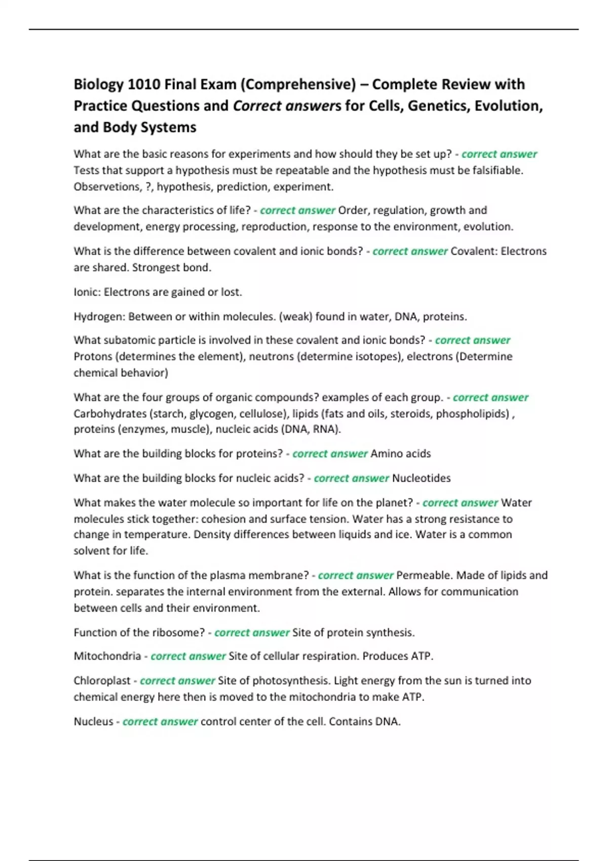 Practice Questions and Correct answers for Cells, Genetics, Evolution,