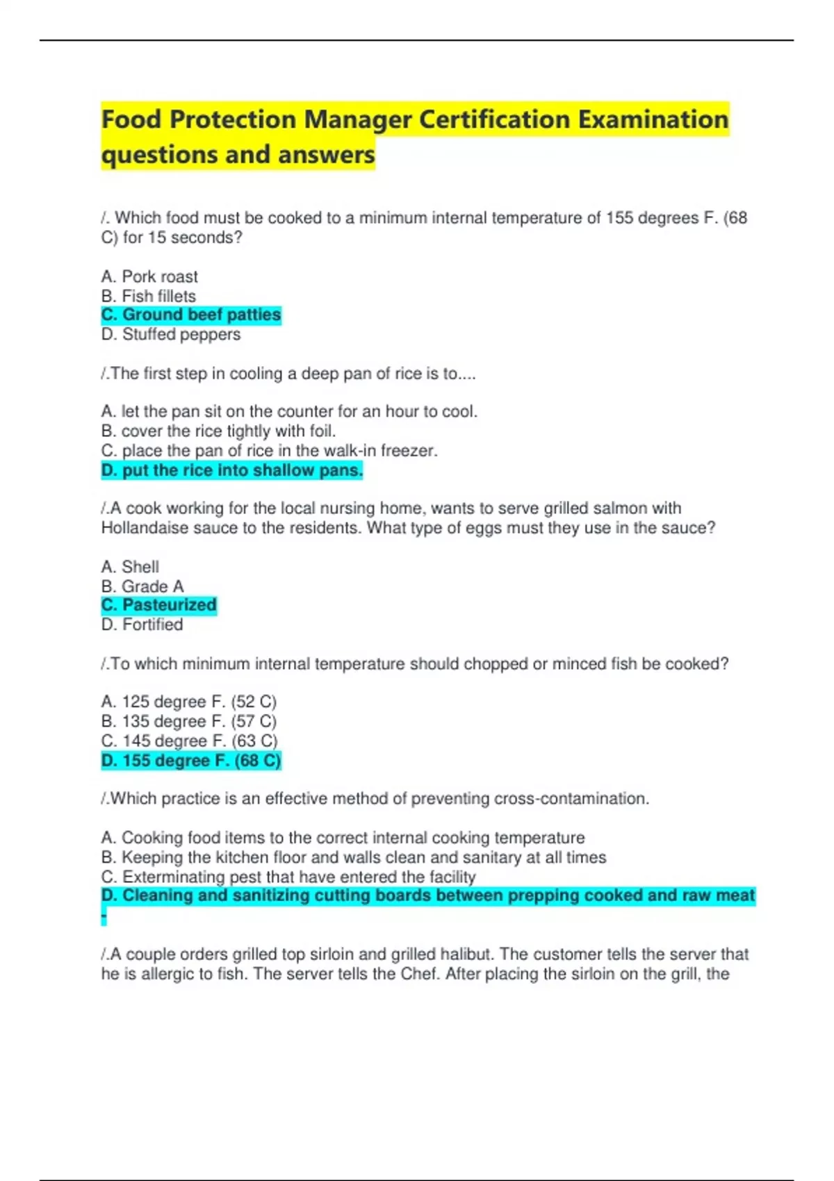 Food Protection Manager Certification Examination questions and answers /. Which food must be cooked to a minimum internal temperature of 155 degrees F. (68 C) for 15 seconds? A. Pork roast B. Fish fillets C. Ground beef patties D. Stuffed peppers /.The first step in cooling a deep pan of rice is to.... A. let the pan sit on the counter for an hour to cool. B. cover the rice tightly with foil. C. place the pan of rice in the walk-in freezer. D. put the rice into shallow pans. /.A cook working for the local nursing home, wants to serve grilled salmon with Hollandaise sauce to the residents. What type of eggs must they use in the sauce? A. Shell B. Grade A C. Pasteurized D. Fortified /.To which minimum internal temperature should chopped or minced fish be cooked? A. 125 degree F. (52 C) B. 135 degree F. (57 C) C. 145 degree F. (63 C) D. 155 degree F. (68 C) /.Which practice is an effective method of preventing cross-contamination. A. Cooking food items to the correct internal cooking temperature B. Keeping the kitchen floor and walls clean and sanitary at all times C. Exterminating pest that have entered the facility D. Cleaning and sanitizing cutting boards between prepping cooked and raw meat - /.A couple orders grilled top sirloin and grilled halibut. The customer tells the server that he is allergic to fish. The server tells the Chef. After placing the sirloin on the grill, the Chef places the halibut in a saute pan. After 10 minutes, the Chef uses the same pair of tongs to turn the halibut and then the steak. The Chef committed A. cross contact B. cross grilling C. cross connection D. cross allergen switching /.A food handler is permitted to work with highly susceptible populations without prior approval from the local regulatory authority when the food handler has a A. diagnosis of norovirus. B. diagnosis of typhoid fever but provides a medical note. C. visibly covered wound. D. case of jaundice for more than 7 days. /.Reusable containers provided by an operation for take-home food must be A. provided and maintained by the customer. B. cleaned and sanitized by the customer before being refilled. C. returned to the operation labeled with the customer's name. D. cleaned and sanitized by the operation before being refilled /.The manager assigns a cook to monitor and record temperatures on the steam table in order to A. keep the food from drying out. B. prevent cross-contamination. C. avoid time-temperature abuse. D. ensure food quality. /.In a self-service area, utensils should be provided for each item to prevent customers from A. taking more than one serving at a time. B. asking a server to dispense food. C. sampling the food. D. using their bare hands to dispense food. /.Food displayed on a salad bar A. must be protected by food guards. B. should be placed on ice. C. should be maintained at 45 degrees F (7 C) D. must include nutritional information. /.The purpose of sneeze guards in self-service areas is to A. maintain food temperature. B. retain food surface moisture. C. protect food from customer contamination. D. keep insects out of food. /.A consumer advisory is required when serving A. cooked-to-order hamburgers. B. stuffed shrimp. C. lamb chops. D. reheated beef stew. /.Food has been honestly presented if it A. has been farmed locally in organic soil B. has been grown without the use of pesticides. C. contains only the freshest ingredients. D. does not contain color additives. /.An example of a corrective action is A. reusing utensils for each new task. B. serving food on a buffet that is below 165 degrees F (74 C) C. using the same equipment for raw food and ready-to-eat food. D. Reheating food on a buffet that is below 135 degrees F (57 C) /.When using a single tank dishwasher, the utensil surface temperature must reach at least A. 160 degrees F (71 C) B. 170 degrees F (77 C) C. 180 degrees F (82 C) D. 190 degrees F (88 C) /.If chemicals are transferred to secondary containers, the secondary containers must be labeled with the chemical's A. expiration date. B. common name. C. usage instructions. D. SDS information. /.Using hard water when preparing a sanitizing solution will cause the sanitizer to be