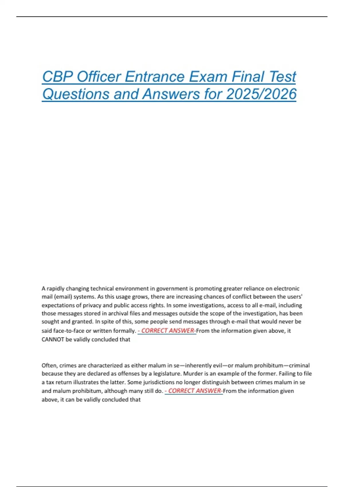 CBP Officer Entrance Exam Final Test Questions and Answers for 2025/2026