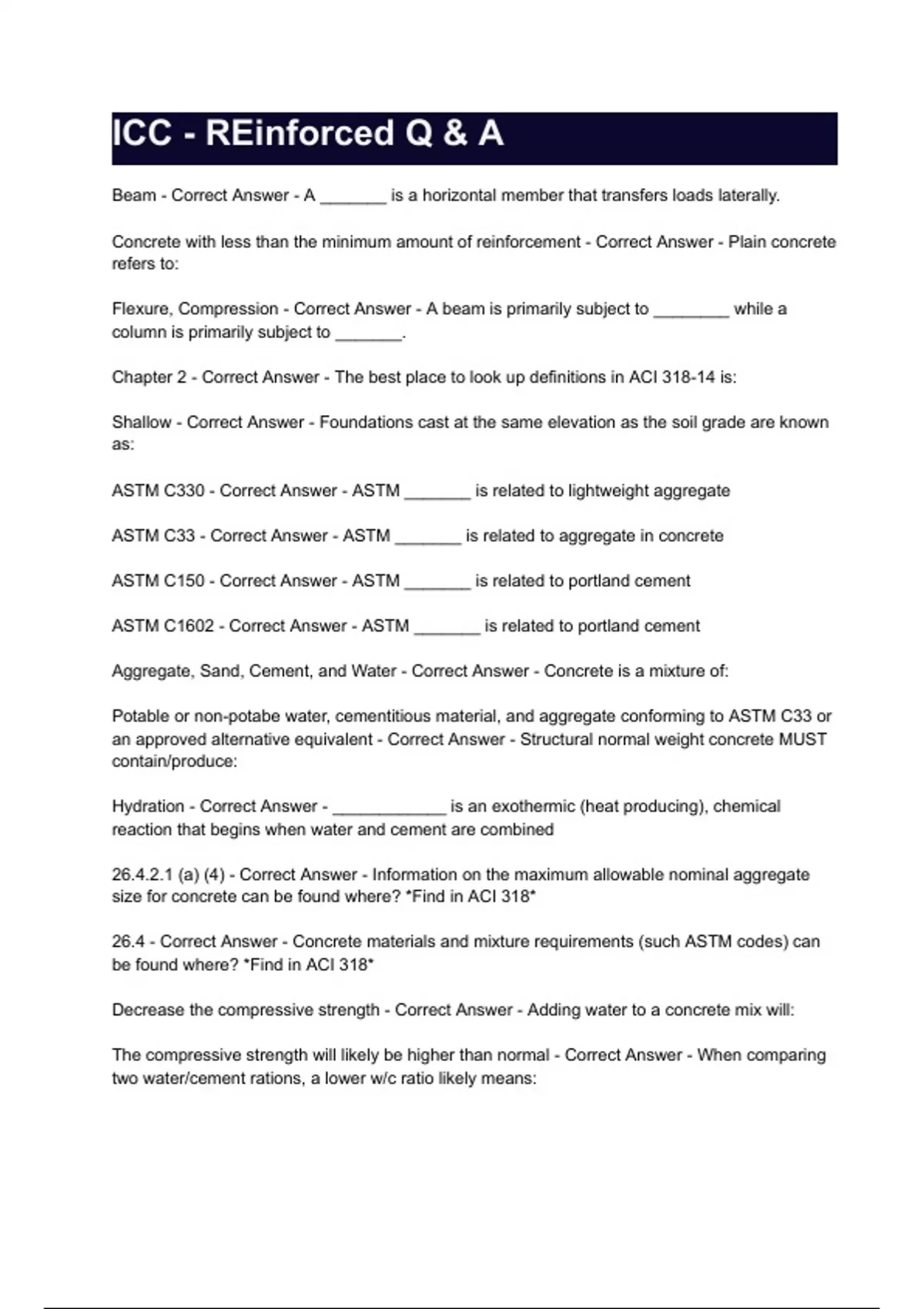ICC - REinforced Q & A Beam - Correct Answer - A _______ is a horizontal member that transfers loads laterally. Concrete with less than the minimum amount of reinforcement - Correct Answer - Plain concrete refers to: Flexure, Compression - Correct Answer - A beam is primarily subject to ________ while a column is primarily subject to _______. Chapter 2 - Correct Answer - The best place to look up definitions in ACI 318-14 is: Shallow - Correct Answer - Foundations cast at the same elevation as the soil grade are known as: ASTM C330 - Correct Answer - ASTM _______ is related to lightweight aggregate ASTM C33 - Correct Answer - ASTM _______ is related to aggregate in concrete ASTM C150 - Correct Answer - ASTM _______ is related to portland cement ASTM C1602 - Correct Answer - ASTM _______ is related to portland cement Aggregate, Sand, Cement, and Water - Correct Answer - Concrete is a mixture of: Potable or non-potabe water, cementitious material, and aggregate conforming to ASTM C33 or an approved alternative equivalent - Correct Answer - Structural normal weight concrete MUST contain/produce: Hydration - Correct Answer - ____________ is an exothermic (heat producing), chemical reaction that begins when water and cement are combined 26.4.2.1 (a) (4) - Correct Answer - Information on the maximum allowable nominal aggregate size for concrete can be found where? *Find in ACI 318* 26.4 - Correct Answer - Concrete materials and mixture requirements (such ASTM codes) can be found where? *Find in ACI 318* Decrease the compressive strength - Correct Answer - Adding water to a concrete mix will: The compressive strength will likely be higher than normal - Correct Answer - When comparing two water/cement rations, a lower w/c ratio likely means: