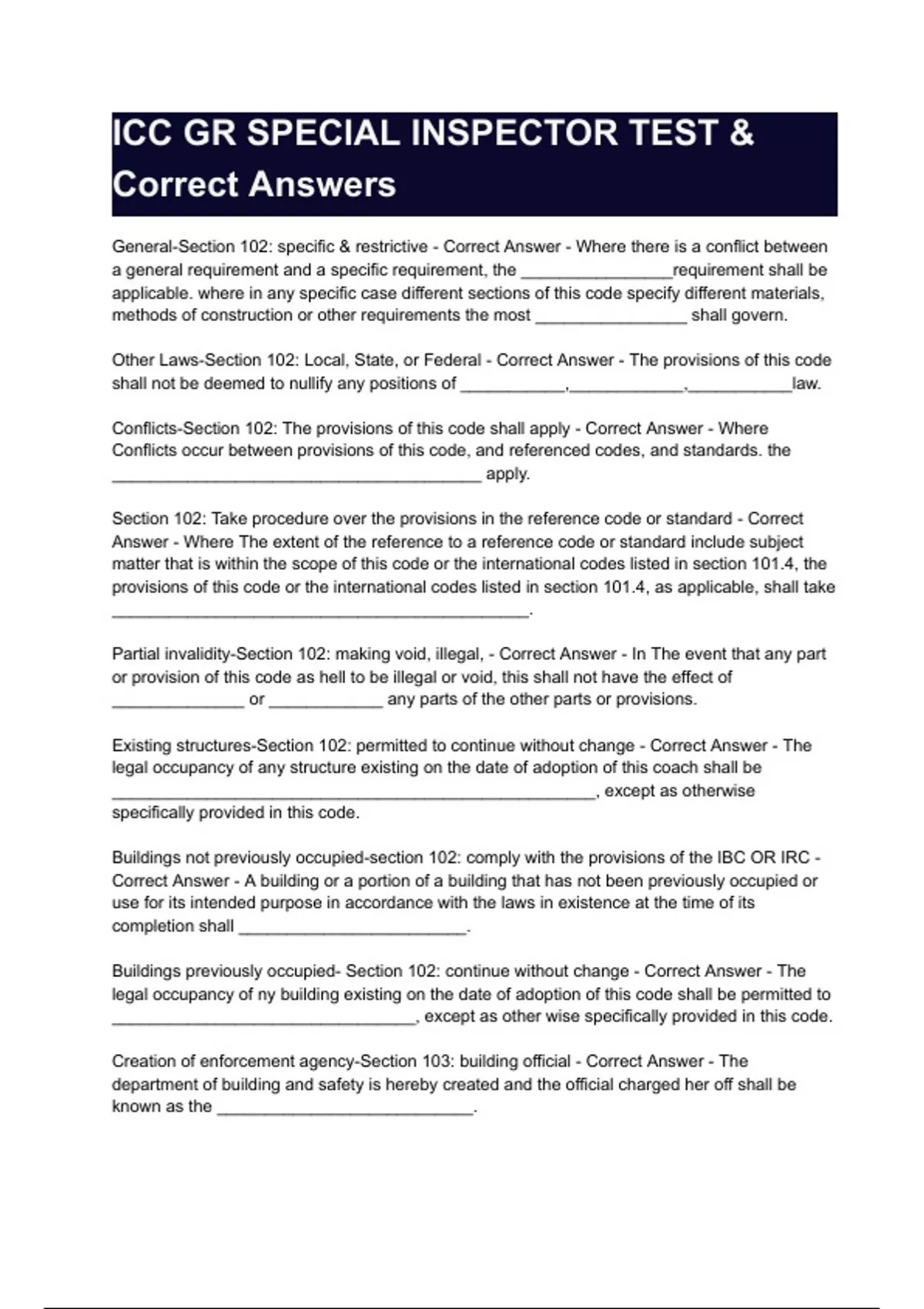 ICC GR SPECIAL INSPECTOR TEST & Correct Answers. General-Section 102: specific & restrictive - Correct Answer - Where there is a conflict between a general requirement and a specific requirement, the ________________requirement shall be applicable. where in any specific case different sections of this code specify different materials, methods of construction or other requirements the most ________________ shall govern. Other Laws-Section 102: Local, State, or Federal - Correct Answer - The provisions of this code shall not be deemed to nullify any positions of ___________,____________,___________law. Conflicts-Section 102: The provisions of this code shall apply - Correct Answer - Where Conflicts occur between provisions of this code, and referenced codes, and standards. the _______________________________________ apply. Section 102: Take procedure over the provisions in the reference code or standard - Correct Answer - Where The extent of the reference to a reference code or standard include subject matter that is within the scope of this code or the international codes listed in section 101.4, the provisions of this code or the international codes listed in section 101.4, as applicable, shall take ____________________________________________. Partial invalidity-Section 102: making void, illegal, - Correct Answer - In The event that any part or provision of this code as hell to be illegal or void, this shall not have the effect of ______________ or ____________ any parts of the other parts or provisions. Existing structures-Section 102: permitted to continue without change - Correct Answer - The legal occupancy of any structure existing on the date of adoption of this coach shall be ___________________________________________________, except as otherwise specifically provided in this code. Buildings not previously occupied-section 102: comply with the provisions of the IBC OR IRC - Correct Answer - A building or a portion of a building that has not been previously occupied or use for its intended purpose in accordance with the laws in existence at the time of its completion shall ________________________. Buildings previously occupied- Section 102: continue without change - Correct Answer - The legal occupancy of ny building existing on the date of adoption of this code shall be permitted to ________________________________, except as other wise specifically provided in this code. Creation of enforcement agency-Section 103: building official - Correct Answer - The department of building and safety is hereby created and the official charged her off shall be known as the ___________________________.