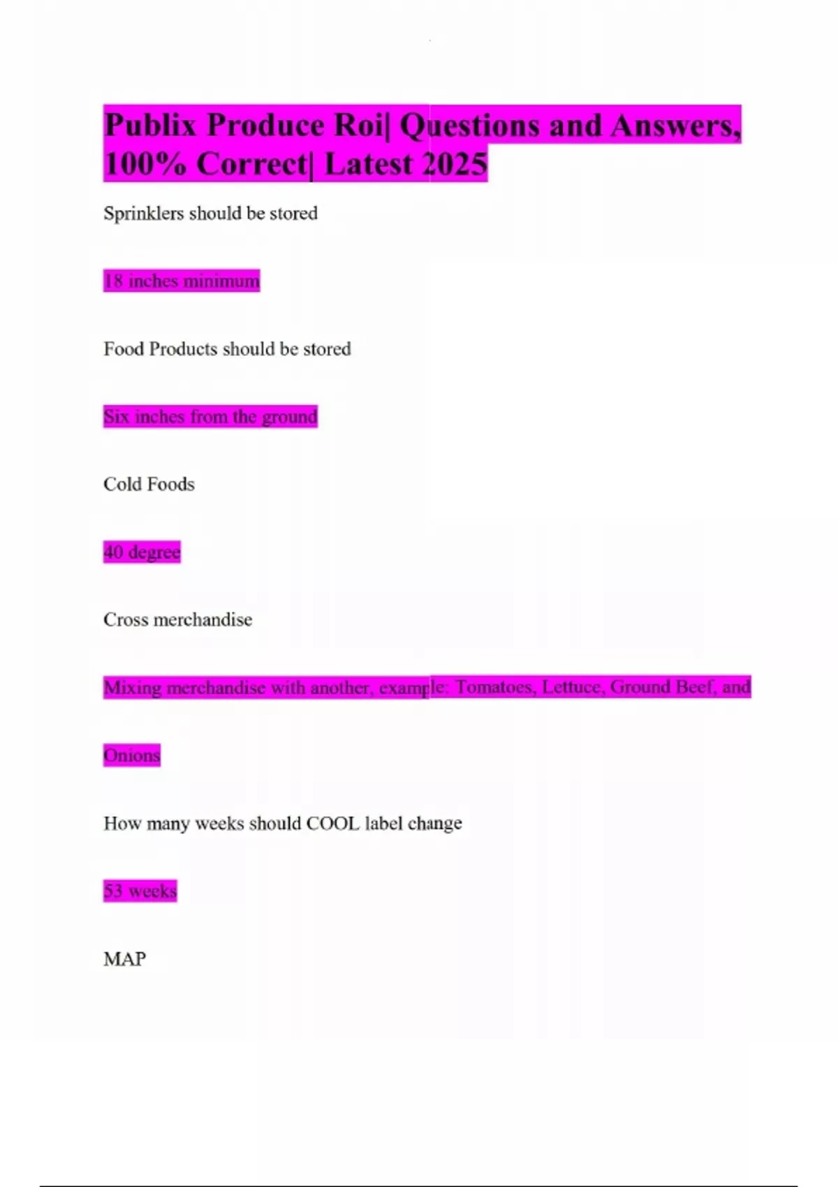 Publix Produce Roi| Questions and Answers, 100% Correct| Latest 2025 Sprinklers should be stored 18 inches minimum Food Products should be stored Six inches from the ground Cold Foods 40 degree Cross merchandise Mixing merchandise with another, example: Tomatoes, Lettuce, Ground Beef, and Onions How many weeks should COOL label change 53 weeks MAP Contains documents to help plan stores phenomenal planning US Food and Drug Administration (FDA) Requires Publix to provide Nutritional information and calories You may use the thermometer to monitor products in store in how many degrees