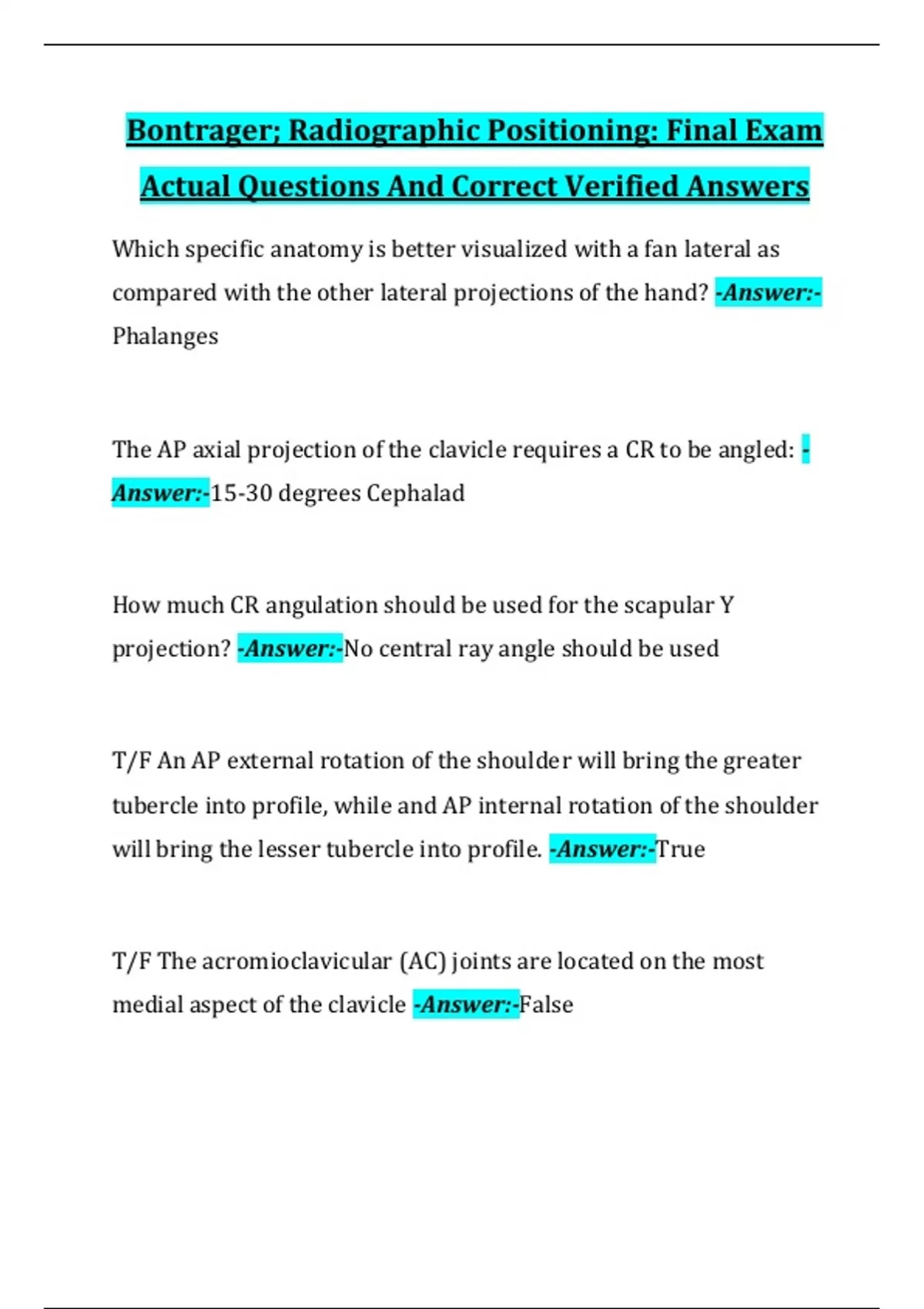 Bontrager; Radiographic Positioning: Final Exam Actual Questions And Correct Verified Answers Which specific anatomy is better visualized with a fan lateral as compared with the other lateral projections of the hand? -Answer:-Phalanges The AP axial projection of the clavicle requires a CR to be angled: -Answer:-15-30 degrees Cephalad How much CR angulation should be used for the scapular Y projection? -Answer:-No central ray angle should be used T/F An AP external rotation of the shoulder will bring the greater tubercle into profile, while and AP internal rotation of the shoulder will bring the lesser tubercle into profile. -Answer:-True T/F The acromioclavicular (AC) joints are located on the most medial aspect of the clavicle -Answer:-False T/F The CR should be directed perpendicular to the coracoid process for and AP projection of the scapula -Answer:-False, 2'' below