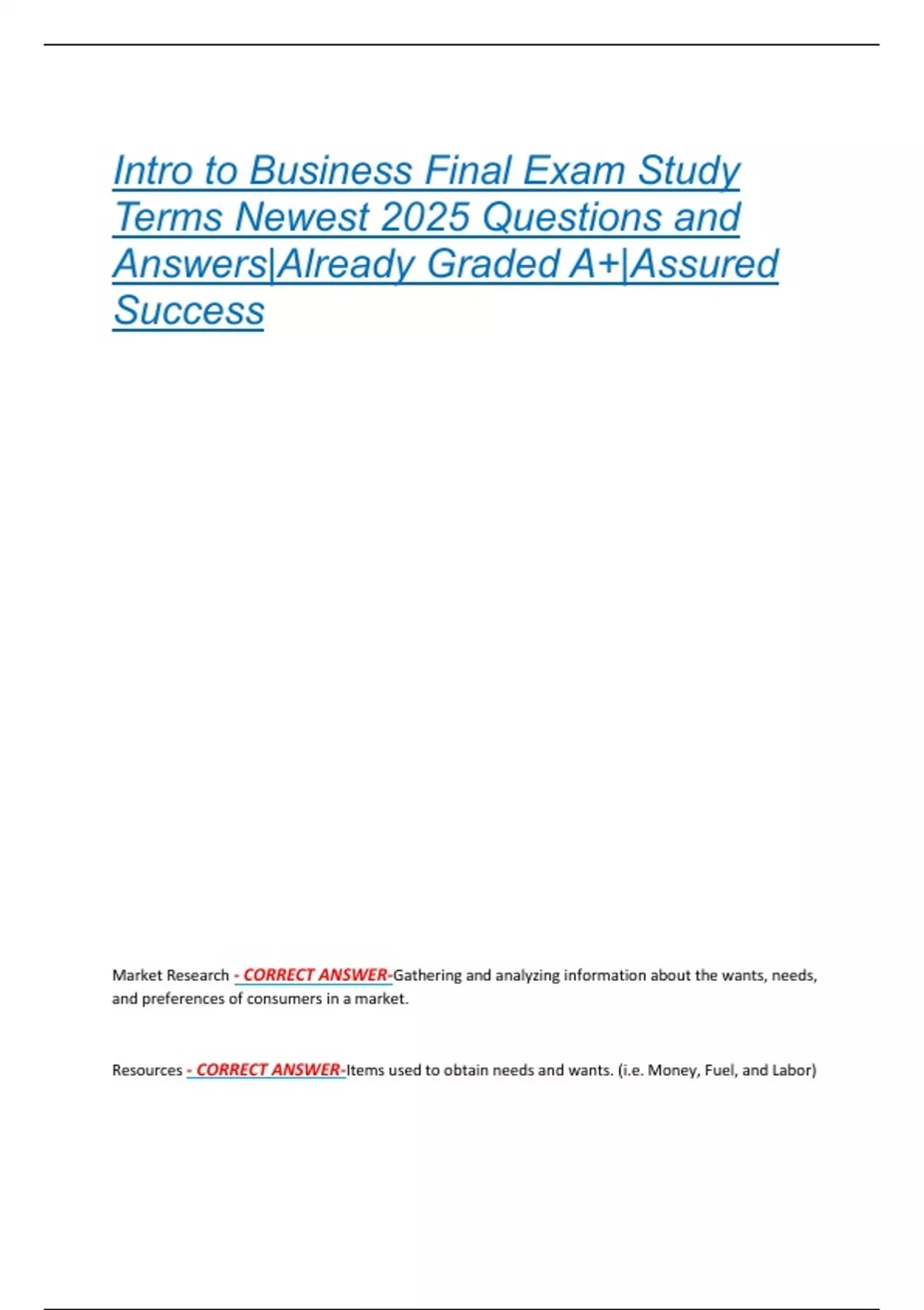 Resources - CORRECT ANSWER-Items used to obtain needs and wants. (i.e. Money, Fuel, and Labor)