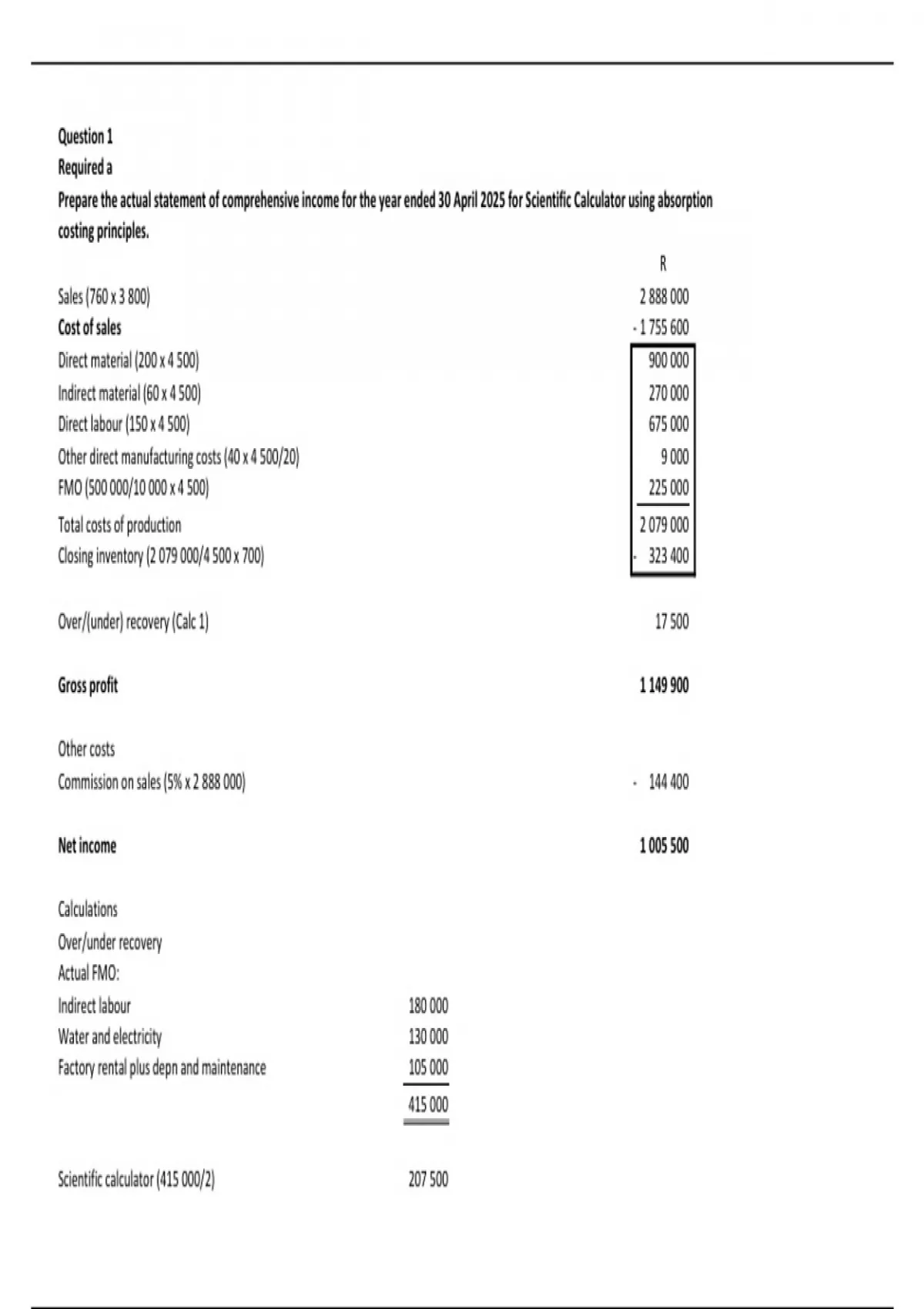 Prepare the actual statement of comprehensive income for the year ended 30 April 2025 for Scientific Calculator using absorption