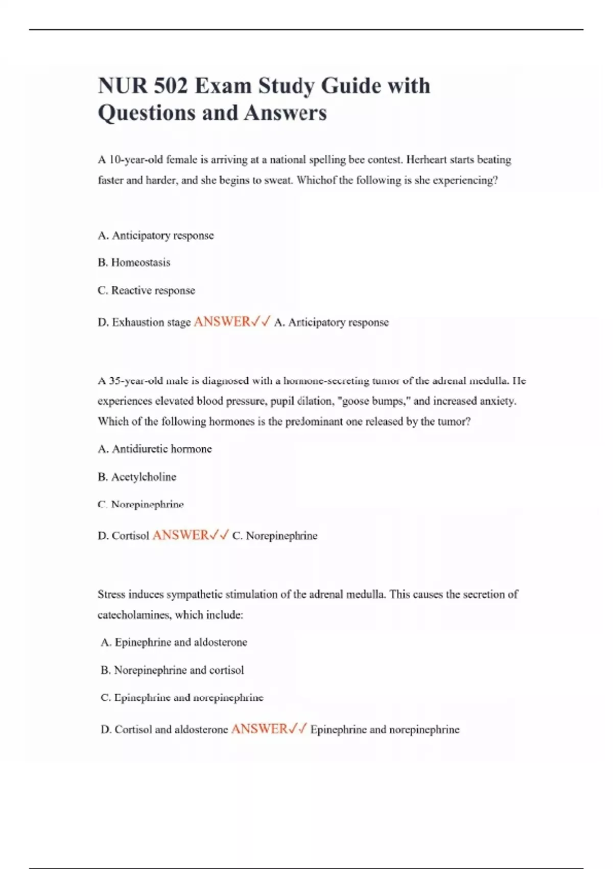 NUR 502 Exam Study Guide with Questions and Answers A 10-year-old female is arriving at a national spelling bee contest. Herheart starts beating faster and harder, and she begins to sweat. Whichof the following is she experiencing? A. Anticipatory response B. Homeostasis C. Reactive response D. Exhaustion stage ANSWER A. Anticipatory response A 35-year-old male is diagnosed with a hormone-secreting tumor of the adrenal medulla. He experiences elevated blood pressure, pupil dilation, "goose bumps," and increased anxiety. Which of the following hormones is the predominant one released by the tumor? A. Antidiuretic hormone B. Acetylcholine C. Norepinephrine D. Cortisol ANSWER C. Norepinephrine Stress induces sympathetic stimulation of the adrenal medulla. This causes the secretion of catecholamines, which include: A. Epinephrine and aldosterone B. Norepinephrine and cortisol C. Epinephrine and norepinephrine D. Cortisol and aldosterone ANSWER Epinephrine and norepinephrine