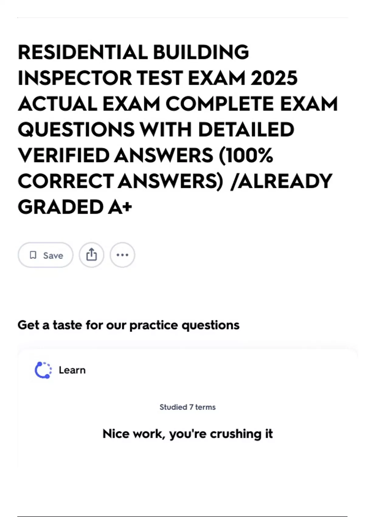 RESIDENTIAL BUILDING INSPECTOR TEST EXAM 2025 ACTUAL EXAM COMPLETE EXAM QUESTIONS WITH DETAILED VERIFIED ANSWERS (100% CORRECT ANSWERS) /ALREADY GRADED A+
