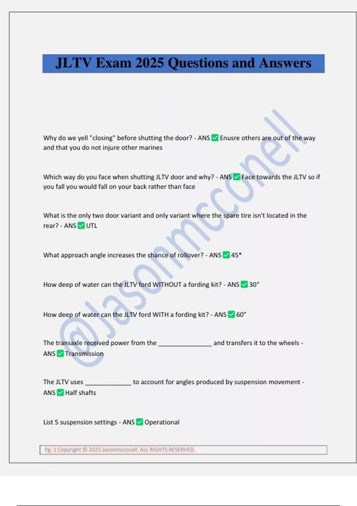 JLTV Exam 2025 Questions and Answers Why do we yell "closing" before shutting the door? - ANS Enusre others are out of the way and that you do not injure other marines Which way do you face when shutting JLTV door and why? - ANS Face towards the JLTV so if you fall you would fall on your back rather than face What is the only two door variant and only variant where the spare tire isn't located in the rear? - ANS UTL What approach angle increases the chance of rollover? - ANS 45* How deep of water can the JLTV ford WITHOUT a fording kit? - ANS 30" How deep of water can the JLTV ford WITH a fording kit? - ANS 60" The transaxle received power from the _______________ and transfers it to the wheels - ANS Transmission The JLTV uses _____________ to account for angles produced by suspension movement - ANS Half shafts List 5 suspension settings - ANS Operational Pg. 2 Copyright © 2025 Jasonmcconell. ALL RIGHTS RESERVED. Loading Tie down Fording SAES What is the unique thing about the JLTV is using the DSDU you can... - ANS Verify systems checks and check fluids Why do high pressure gas pumps automatically stop after 10 minutes? - ANS To prevent overheating What does the suspension air light on the dash indicate when lit? - ANS You will not be able to adjust ride height Independent suspension uses __________________ to keep the tires in contact with the ground - ANS High pressure gas shocks What are the advantages of Air Over Hydraulic brakes? - ANS Quicker stop time More reliability What are the four CTIS settings? - ANS HWY CC MSS EMER What does CTIS stand for? - ANS Central Tire Inflation System List everything combat ov