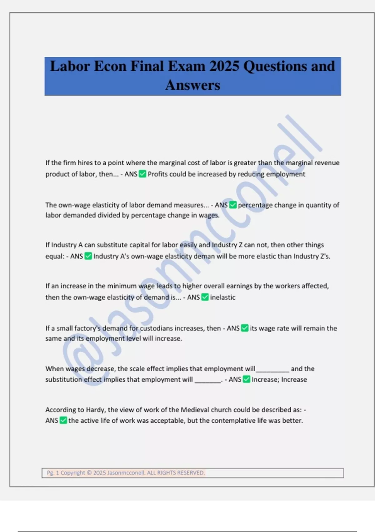 Labor Econ Final Exam 2025 Questions and Answers If the firm hires to a point where the marginal cost of labor is greater than the marginal revenue product of labor, then... - ANS Profits could be increased by reducing employment The own-wage elasticity of labor demand measures... - ANS percentage change in quantity of labor demanded divided by percentage change in wages. If Industry A can substitute capital for labor easily and Industry Z can not, then other things equal: - ANS Industry A's own-wage elasticity deman will be more elastic than Industry Z's. If an increase in the minimum wage leads to higher overall earnings by the workers affected, then the own-wage elasticity of demand is... - ANS inelastic If a small factory's demand for custodians increases, then - ANS its wage rate will remain the same and its employment level will increase. When wages decrease, the scale effect implies that employment will_________ and the substitution effect implies that employment will _______. - ANS Increase; Increase According to Hardy, the view of work of the Medieval church could be described as: - ANS the active life of work was acceptable, but the contemplative life was better. Pg. 2 Copyright © 2025 Jasonmcconell. ALL RIGHTS RESERVED. The marginal product of labor tells us - ANS the additional output produced by the last employee hired. Total Population: 200 million Employed: 120 million Unemployed: 8 million Retired: 32 milliom Population under age 16: 40 milliom -Given the data, the labor force participation rate is... -Given the date, the unemployment rate it... - ANS 1. 80% 2. 6.25% When the price of robots rises, we observe that the employment of unskilled labor falls. This tells us that... - ANS robots and unskilled labor are gross complements. If two inputs are complements in production... - ANS then the inputs are gross complements If the wage paid to steel workers goes up by 24 percent, this causes the quantity of steel workers demanded to go down by 8 percent. Therefore, the own-wage elasticity of demand for these workers is... - ANS -0.33 In an industry, when the price of computers goes up, the company employs more high skilles workers. This implies... - ANS the subsitition effect dominated the scale effect Results from economic research show that most of a payroll tax is paid by the employees in the form of lowered wages. If