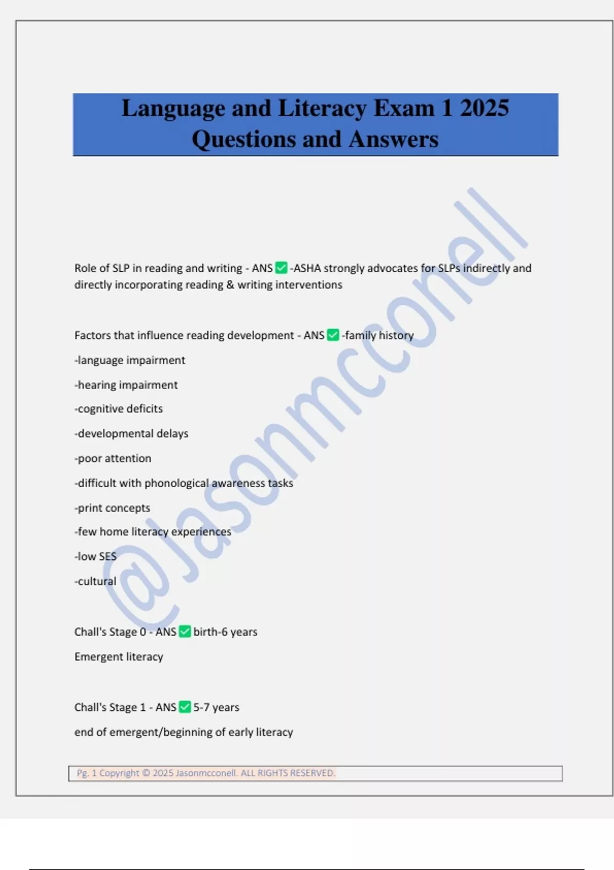 Language and Literacy Exam 1 2025 Questions and Answers Role of SLP in reading and writing - ANS -ASHA strongly advocates for SLPs indirectly and directly incorporating reading & writing interventions Factors that influence reading development - ANS -family history -language impairment -hearing impairment -cognitive deficits -developmental delays -poor attention -difficult with phonological awareness tasks -print concepts -few home literacy experiences -low SES -cultural Chall's Stage 0 - ANS birth-6 years Emergent literacy Chall's Stage 1 - ANS 5-7 years end of emergent/beginning of early literacy Pg. 2 Copyright © 2025 Jasonmcconell. ALL RIGHTS RESERVED. Chall's Stage 2 - ANS 7-8 years early literacy Chall's Stage 3 - ANS 8-14 years conventional literacy emergent literacy - ANS children's active efforts to construct literacy knowledge through informal experiences early literacy - ANS skills and knowledge that come before and lead up to (forerunners) conventional reading and writing conventional literacy - ANS reading and writing according to the rule-governed system of the alphabetic principle and being able to read to learn Primary targets of a preventative approach - ANS Code related skills; oral language skills Code Related skills - ANS -phonological awareness -print awareness -alphabet knowledge -emergent writing Oral language skills - ANS -vocabulary -inferential language Phonological awareness -