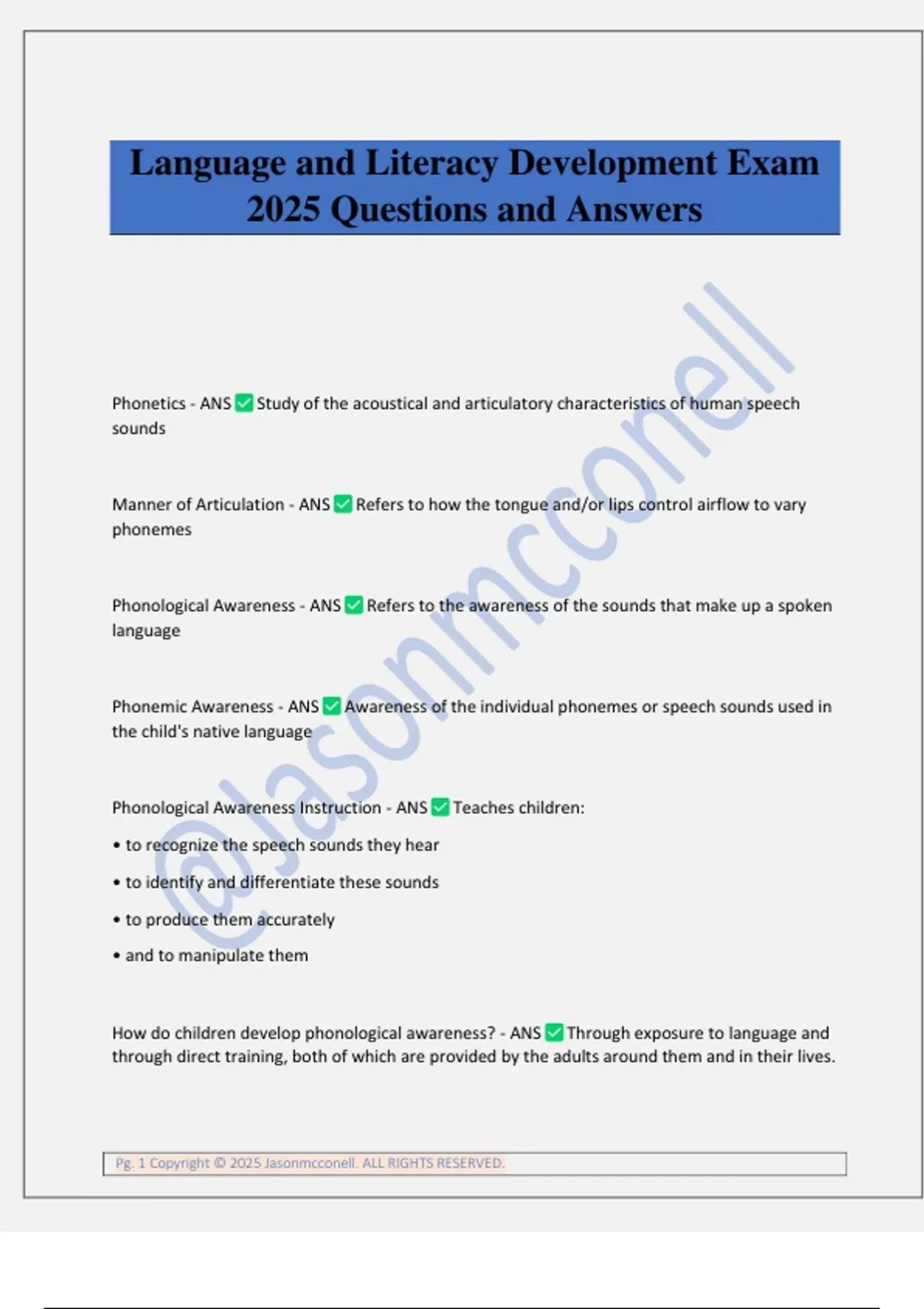Language and Literacy Development Exam 2025 Questions and Answers Phonetics - ANS Study of the acoustical and articulatory characteristics of human speech sounds Manner of Articulation - ANS Refers to how the tongue and/or lips control airflow to vary phonemes Phonological Awareness - ANS Refers to the awareness of the sounds that make up a spoken language Phonemic Awareness - ANS Awareness of the individual phonemes or speech sounds used in the child's native language Phonological Awareness Instruction - ANS Teaches children: • to recognize the speech sounds they hear • to identify and differentiate these sounds • to produce them accurately • and to manipulate them How do children develop phonological awareness? - ANS Through exposure to language and through direct training, both of which are provided by the adults around them and in their lives. Pg. 2 Copyright © 2025 Jasonmcconell. ALL RIGHTS RESERVED. Phonics - ANS Knowledge of letter-sound relationships Decoding - ANS The ability to use knowledge of letter-sound relationships to accurately read a word. Encoding - ANS Blending/combining individual sounds/letters to form words Strong phonological and phonemic awareness in children is often a predictor of what? - ANS Future long-term success in spelling, reading, and literacy performance Orthography - ANS A set of conventions for writing a language. It includes norms of spelling, hyphenation, capitalization, word breaks, emphasis, and punctuation. Orthographic Processing - ANS Using the visual system to form, store, and recall words Phonology - ANS the study of speech sounds and how they change depending on certain situations or placements in syllables, words, and sentences. What does skilled reading require? - ANS The coordination of orthographic processing, phonological processing, and the processing of meaning and context. Morphology - ANS the smallest unit of speech that has meaning. -- plural "s" ending -- past tense "ed" ending Semantics - ANS the aspect of language function that relates to understanding the meanings of words, phrases and sentences, and using words appropriately when we speak Pg. 3 Copyright © 2025 Jasonmcconell. ALL RIGHTS RESERVED. Pragmatics - ANS he area of language function that embraces the use of language in social contexts (knowing what to say, how to say it, and when to say it - and how to "be" with other people). -- how to speak at home vs. how to speak at school "Following the CAR" - ANS Comment - the adult should comment on what a child is looking at, handling, or talking about, then wait 5 seconds. Ask - to continue the conversation the adult has begun and/or to start a new one, the adult should then ask the child questions about something the child is looking at, handling, or talking about. Adult should then wait 5 seconds again to give the child time to respond Respond - Once the child gives an oral response, the adult should respond to what the child says by repeating the child's response and then adding a bit more information to extend the child's knowledge. What is a "real" conversation? - ANS Conversations that interest the child and consist of three to four exchanges/turns between the child and the adult Teaching strategies that support children's active participation in real conversations - ANS • attentively listening to what the children say • inviting children to join extended conversations with adults and peers • demonstrating a genuine interest in and affection for the children • sending verbal and non-verbal messages that are consistent • avoiding making judgemental comments about children or anybody else to or in front of the children • availing oneself of sponta
