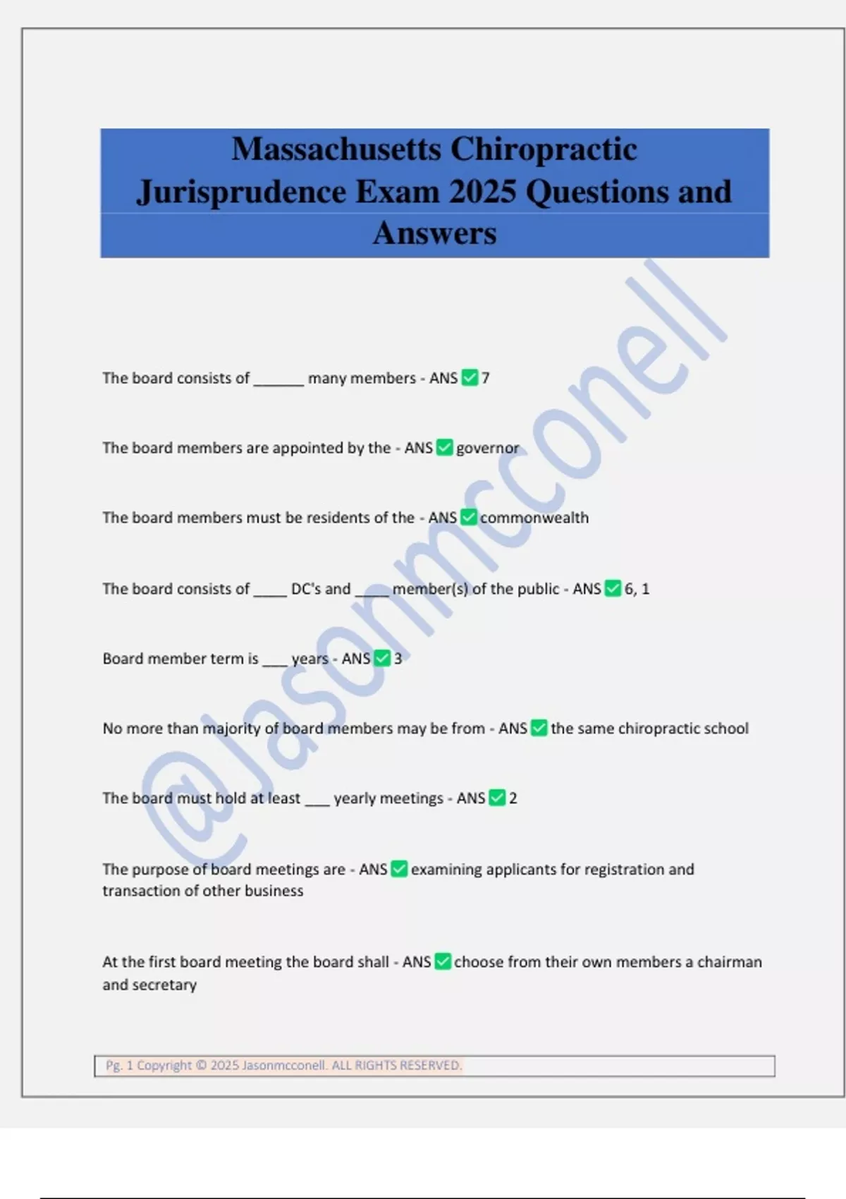 Massachusetts Chiropractic Jurisprudence Exam 2025 Questions and Answers The board consists of ______ many members - ANS 7 The board members are appointed by the - ANS governor The board members must be residents of the - ANS commonwealth The board consists of ____ DC's and ____ member(s) of the public - ANS 6, 1 Board member term is ___ years - ANS 3 No more than majority of board members may be from - ANS the same chiropractic school The board must hold at least ___ yearly meetings - ANS 2 The purpose of board meetings are - ANS examining applicants for registration and transaction of other business At the first board meeting the