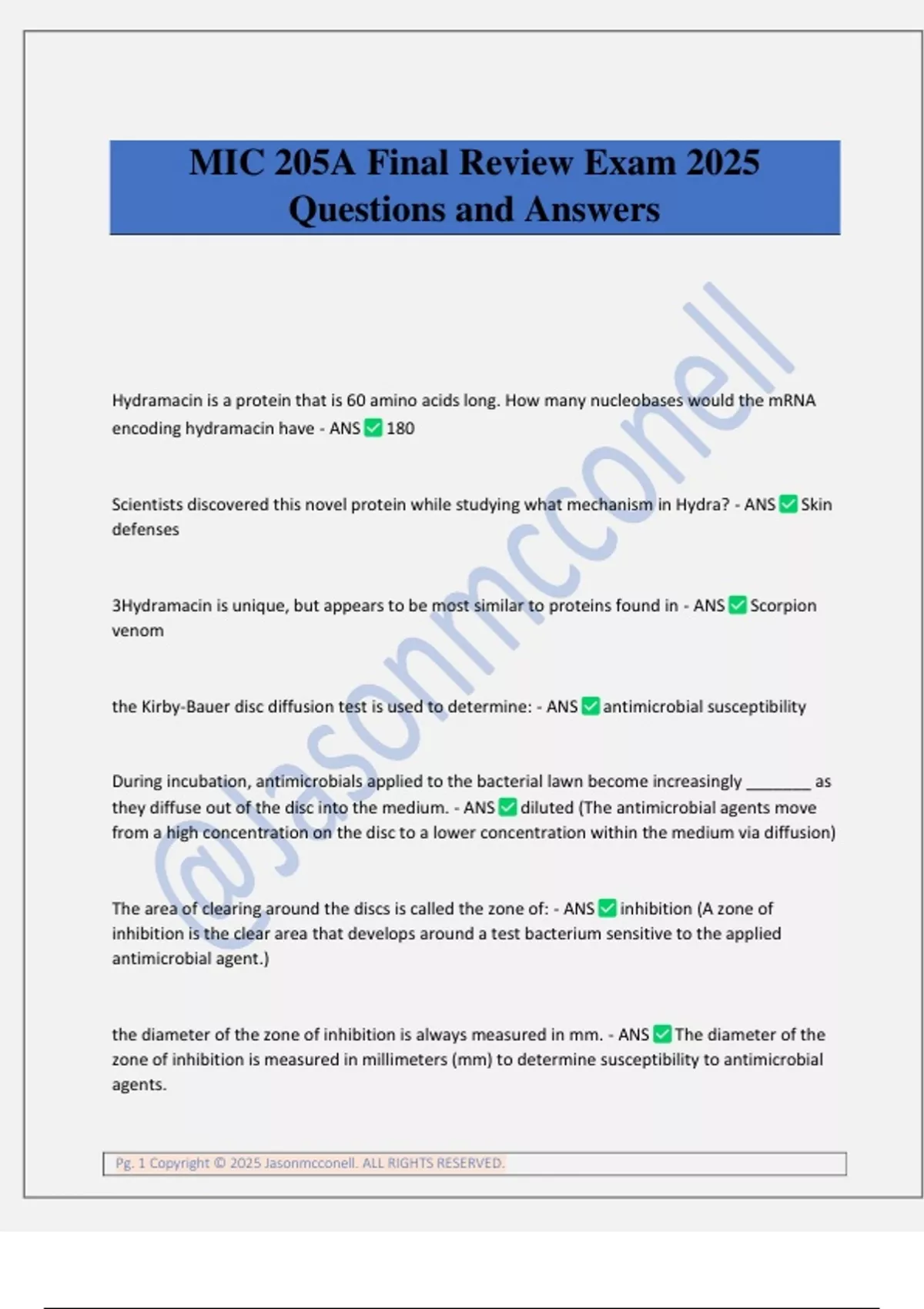 MIC205A Chapter 1 Exam 2025 Questions and Answers Which defines spontaneous generation? - ANS Life arose from non-living matter John Needham assumed that microorganisms appearing in boiled broth did so by spontaneous generation because - ANS He believed that boiling would kill any living thing in the broth The theory that living things come from other living things is - ANS Biogenesis What was the contribution of Cohn and Tyndall? - ANS Recognized the existence of heat- resistant microbes and endospores Unlike the term microorganism, the word microbe also includes - ANS Viruses The disproving of spontaneous generation led to an era called - ANS Golden Age of Microbiology The concept of living things arising from vital forces in non-living or decomposing materials was known as which of the following? - ANS Spontaneous generation Rank the steps in the scientific process in order. Start with the earliest at the top. Instructions - ANS Pg. 2 Copyright © 2025 Jasonmcconell. ALL RIGHTS RESERVED. John Needham produced results that Blank______ spontaneous generation when he showed that broths that had been boiled and then sealed with a cork Blank______. - ANS support; could still give rise to microorganisms The results collected by observation and experimentation during the scientific method are called the - ANS Data What is the theory of biogenesis? - ANS Living things come from other living things Benefits of normal microbiota include all EXCEPT which of the following? - ANS They damage host tissue, allowing our immune system to rid the body of microbes How did John Tyndall provide evidence against spontaneous generation? - ANS He showed that dust does carry microbes. The germ theory of disease stated that - ANS Microorganisms could cause infection and disease (T/F) Without microorganisms, we would run out of certain nutrients. - ANS True Developing a testable hypothesis and defining the specific methods to be used to test the hypothesis is the next step after - ANS Identifying a research idea A scientific experiment includes a component that rules out alternative explanations of the results by showing that the only feature that varied in the experiment was the characteristic being tested. The component that does this is called a(n) - ANS Control Today, the bacteria ad