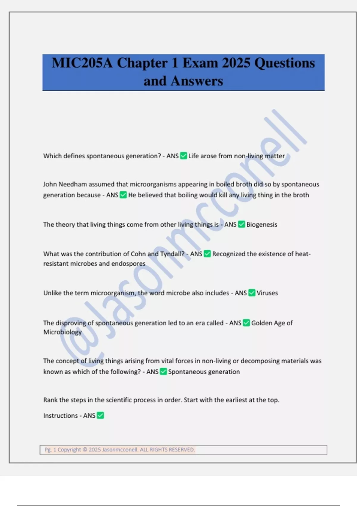 MIC205A Chapter 1 Exam 2025 Questions and Answers Which defines spontaneous generation? - ANS Life arose from non-living matter John Needham assumed that microorganisms appearing in boiled broth did so by spontaneous generation because - ANS He believed that boiling would kill any living thing in the broth The theory that living things come from other living things is - ANS Biogenesis What was the contribution of Cohn and Tyndall? - ANS Recognized the existence of heat- resistant microbes and endospores Unlike the term microorganism, the word microbe also includes - ANS Viruses The disproving of spontaneous generation led to an era called - ANS Golden Age of Microbiology The concept of living things arising from vital forces in non-living or decomposing materials was known as which of the following? - ANS Spontaneous generation Rank the steps in the scientific process in order. Start with the earliest at the top. Instructions - ANS Pg. 2 Copyright © 2025 Jasonmcconell. ALL RIGHTS RESERVED. John Needham produced results that Blank______ spontaneous generation when he showed that broths that had been boiled and then sealed with a cork Blank______. - ANS support; could still give rise to microorganisms The results collected by observation and experimentation during the scientific method are called the - ANS Data What is the theory of biogenesis? - ANS Living things come from other living things Benefits of normal microbiota include all EXCEPT which of the following? - ANS They damage host tissue, allowing our immune system to rid the body of microbes How did John Tyndall provide evidence against spontaneous generation? - ANS He showed that dust does carry microbes. The germ theory of disease stated that - ANS Microorganisms could cause infection and disease (T/F) Without microorganisms, we would run out of certain nutrients. - ANS True Developing a testable hypothesis and defining the specific methods to be used to test the hypothesis is the next step after - ANS Identifying a research idea A scientific experiment includes a component that rules out alternative explanations of the results by showing that the only feature that varied in the experiment was the characteristic being tested. The component that does this is called a(n) - ANS Control Today, the bacteria added to some fermented milk products are advertised as - ANS Probiotic