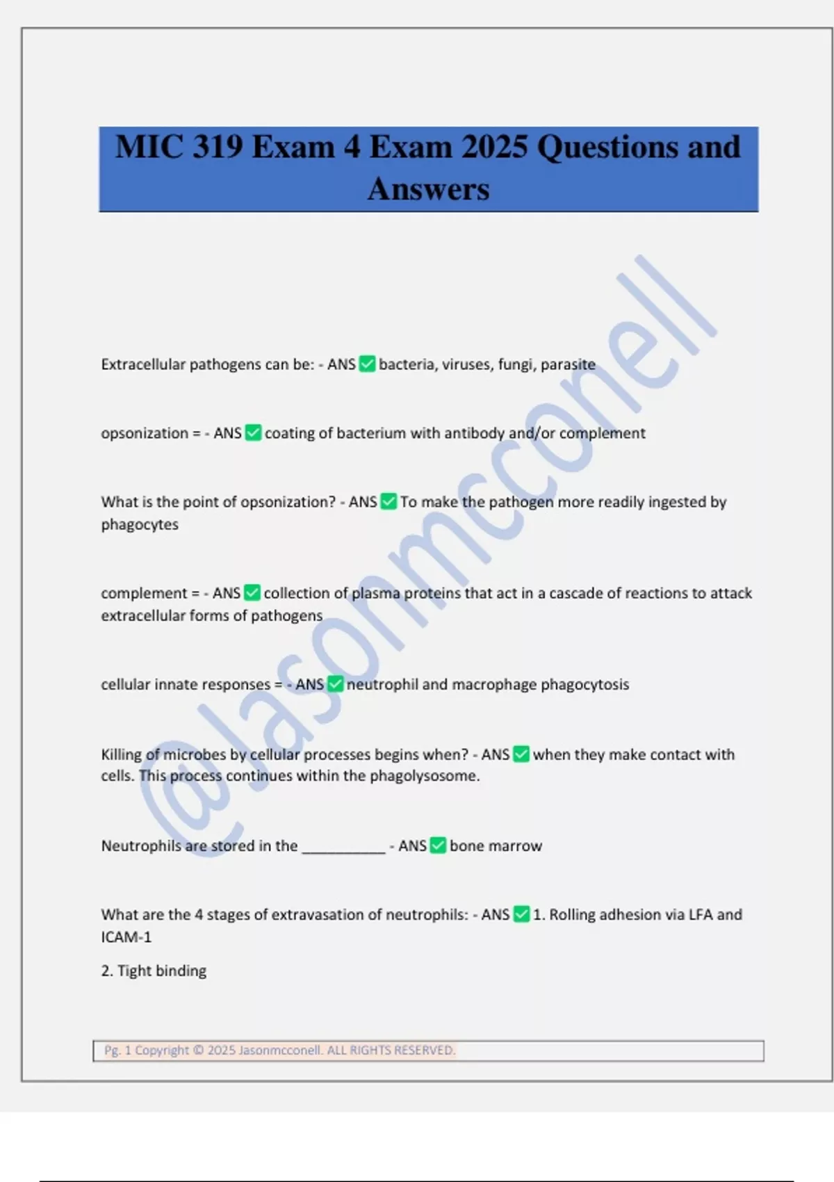 MIC 319 Exam 4 Exam 2025 Questions and Answers Extracellular pathogens can be: - ANS bacteria, viruses, fungi, parasite opsonization = - ANS coating of bacterium with antibody and/or complement What is the point of opsonization? - ANS To make the pathogen more readily ingested by phagocytes complement = - ANS collection of plasma proteins that act in a cascade of reactions to attack extracellular forms of pathogens cellular innate responses = - ANS neutrophil and macrophage phagocytosis Killing of microbes by cellular processes begins when? - ANS when they make contact with cells. This process continues within the phagolysosome. Neutrophils are stored in the __________ - ANS bone marrow What are the 4 stages of extravasation of neutrophils: - ANS 1. Rolling adhesion via LFA and ICAM-1 2. Tight binding Pg. 2 Copyright © 2025 Jasonmcconell. ALL RIGHTS RESERVED. 3. Diapedesis 4. Migration along CXCL8 chemokine gradient Receptor for complement? - ANS CD4 Receptor for LPS? - ANS CD14 Molecular innate response to extracellular bacteria? - ANS complement proteins MAC refers to - ANS complement PF referes to - ANS perforin Who discovered P1 and P2 - ANS Dr. Podack The killer domain of pore forming protein is the _____ domain - ANS MACPF Extracellular batteria are killed by - ANS complement membrane attack complex poly-C9 Virus infected cells are killed by - ANS P1 Intracellular bacteria are killed by - ANS P2 The last event of C9 is _______ - ANS making the hole in the bacteria Size of poly C-9 pore? - ANS 110-120 A